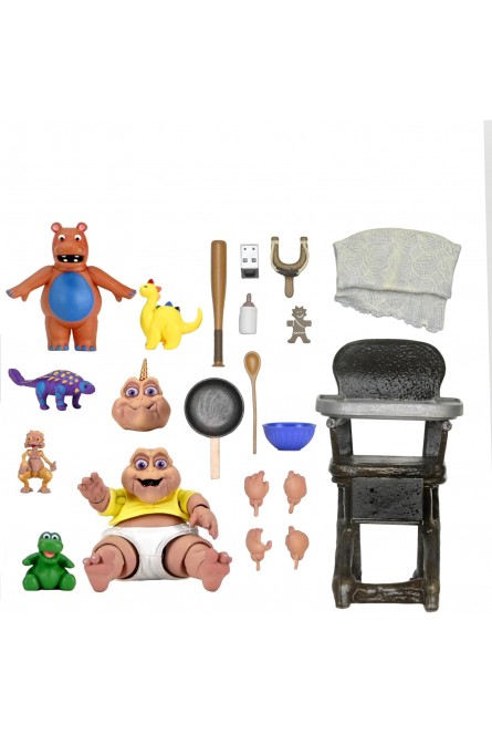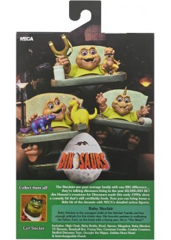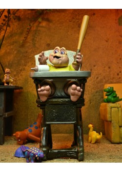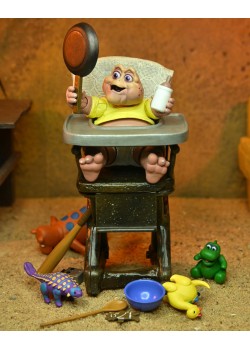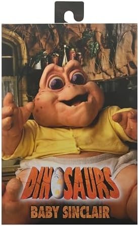 Prepárate para un viaje directo a los años 90 con la Figura Ultimate Baby Sinclair Dinosaurios Articulada 10 cms de NECA, perteneciente a la famosa línea Reel Toys. Este adorable y algo travieso bebé de la familia Sinclair llega con todo su encanto y sus frases inolvidables de la divertidísima serie de televisión Dinosaurios. ¡No mamá! Sí, ese bebé. La figura cuenta con articulaciones y un nivel de detalle increíble que captura a la perfección su aspecto en pantalla. Pero eso no es todo: incluye nada menos que 17 accesorios para recrear tus escenas favoritas o inventar nuevas travesuras. Encontrarás su trona clásica, varios juguetes, una cabeza intercambiable con diferentes expresiones, su inseparable tirachinas y hasta utensilios de cocina para sus desastres culinarios. La caja con tapa abatible es una joya por sí misma, repleta de fotos divertidísimas del personaje, perfecta tanto para exhibir como para conservar cerrada. Ideal para coleccionistas, nostálgicos o fans del humor prehistórico, esta figura de NECA es el homenaje definitivo al bebé más adorable y escandaloso de la televisión. No te la pierdas, o podrías recibir un “¡NO MAMÁ!” de tamaño jurásico.