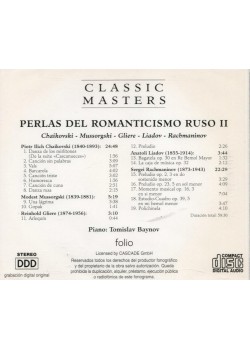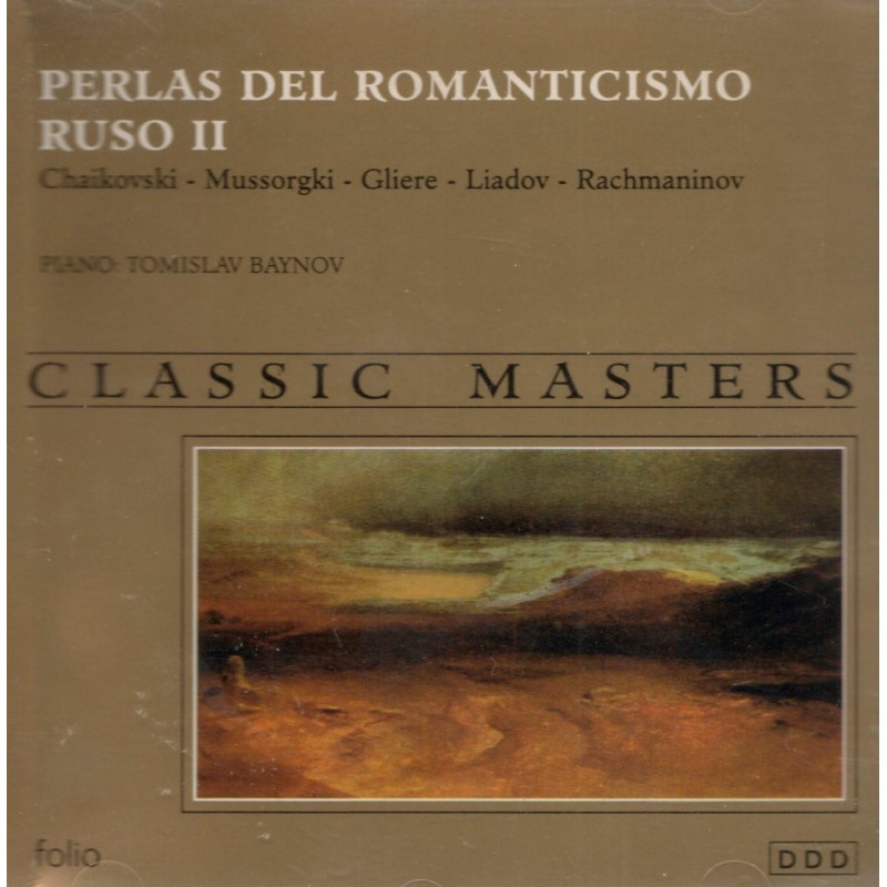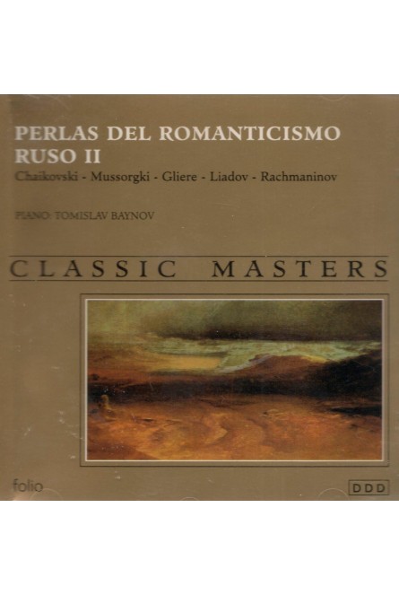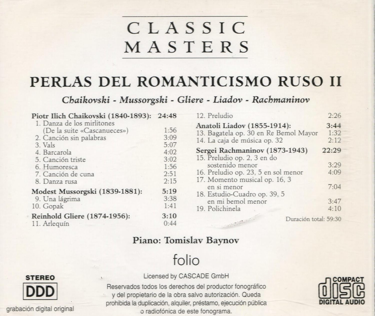 Descubre la magia del romanticismo ruso con esta exquisita colección de obras maestras para piano interpretadas magistralmente por Tomislav Baynov. Este álbum reúne las perlas más brillantes de cinco compositores fundamentales: Chaikovski, Mussorgski, Gliere, Liadov y Rachmaninov. Con una duración total de 59:30 minutos, el disco incluye 19 piezas cuidadosamente seleccionadas que abarcan desde la emotiva 'Danza de los mirilitones' de Chaikovski hasta la impresionante 'Polichinela' de Rachmaninov. Cada interpretación captura la profunda expresividad y el virtuosismo técnico característicos del período romántico ruso. La grabación digital en estéreo garantiza una experiencia auditiva de alta calidad, permitiendo apreciar cada matiz y detalle de estas composiciones inmortales. Una joya imprescindible para los amantes de la música clásica y especialmente para los aficionados al repertorio pianístico ruso del siglo XIX.