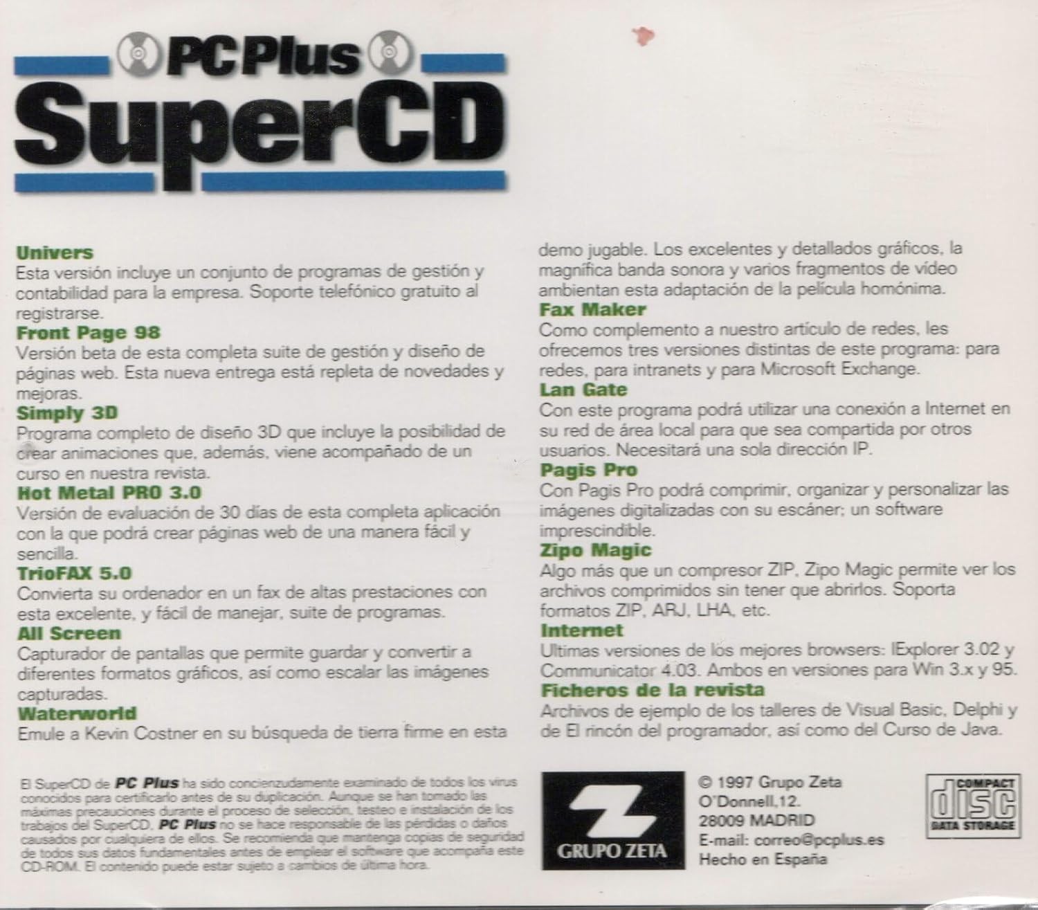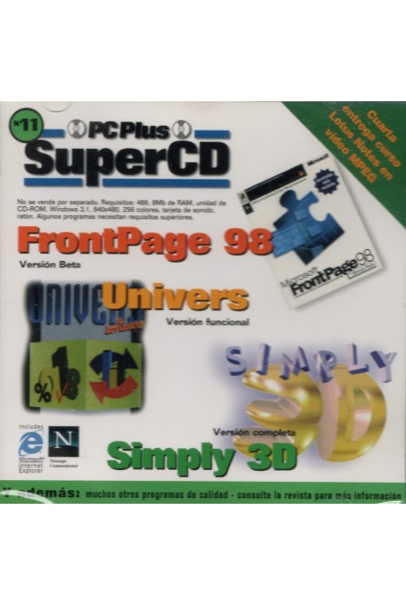 Descubre el SuperCD de PC Plus, una completa colección de software que incluye FrontPage 98 en su versión beta para el diseño y gestión de páginas web. Este paquete integral contiene herramientas esenciales como Simply 3D para diseño tridimensional, Univers para gestión empresarial, y utilidades como Zipo Magic para compresión de archivos. Compatible con Windows 3.1 y Windows 95, requiere 4MB de RAM, unidad CD-ROM y tarjeta de sonido. El paquete incluye Internet Explorer y Netscape Communicator para una experiencia web completa. Ideal para profesionales y usuarios que buscan soluciones completas de diseño web, gestión de archivos y productividad empresarial. Incluye soporte telefónico gratuito al registrarse y viene con documentación en español. El software está optimizado para equipos con resolución de 256 colores y ofrece una interfaz intuitiva para usuarios de todos los niveles.