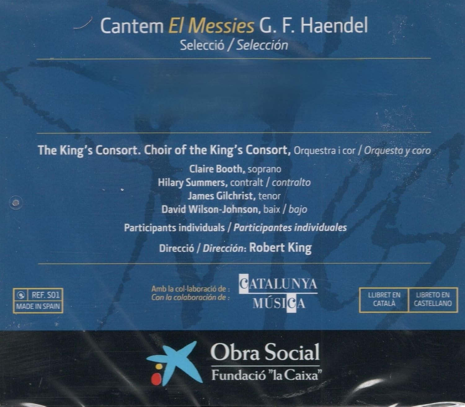 Experimente la majestuosidad de 'El Mesías' de G.F. Handel en esta excepcional selección interpretada por The King's Consort. Bajo la magistral dirección de Robert King, esta grabación presenta una destacada colaboración entre orquesta y coro, con las extraordinarias voces de Claire Booth (soprano), Hilary Summers (contralto), James Gilchrist (tenor) y David Wilson-Johnson (bajo). Esta producción, realizada en colaboración con Catalunya Música y la Fundació 'la Caixa', ofrece una interpretación refinada de una de las obras más emblemáticas del repertorio barroco. El álbum incluye una cuidadosa selección de los momentos más significativos de este oratorio, permitiendo al oyente disfrutar de la brillantez compositiva de Handel y la excelencia interpretativa del conjunto. Disponible con libreto en catalán y castellano, esta grabación representa una oportunidad única para adentrarse en esta obra maestra de la música sacra.