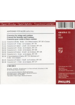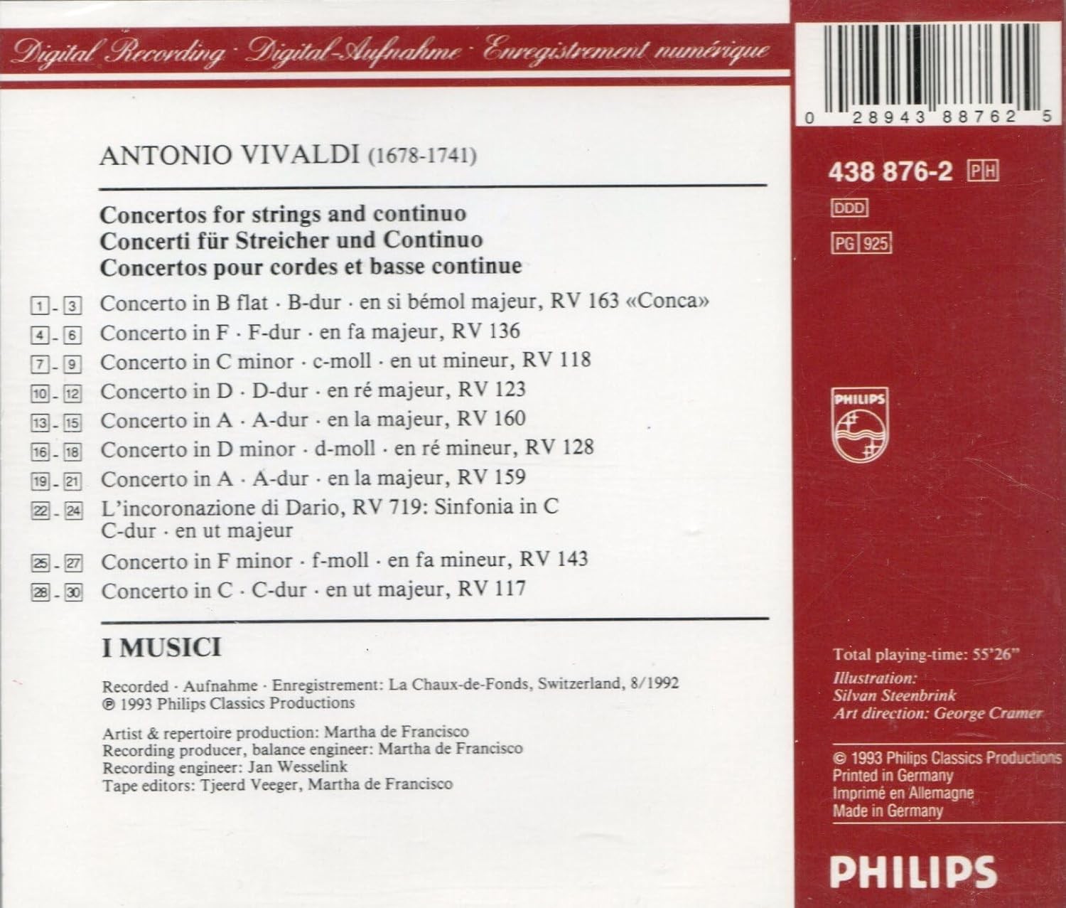 Descubre la majestuosidad de la música barroca con esta exquisita colección de Conciertos para Cuerdas de Vivaldi, interpretada magistralmente por I Musici en esta grabación digital de Philips Classics. El álbum presenta diez conciertos magistrales, incluyendo obras destacadas como el Concerto en Si bemol mayor 'Conca' RV 163 y L'incoronazione di Dario RV 719. Grabado en La Chaux-de-Fonds, Suiza, este álbum de 1992 ofrece una duración total de 55 minutos y 26 segundos de pura delicia musical. La interpretación histórica de I Musici captura la esencia y el espíritu del período barroco con una precisión extraordinaria. Cada concierto demuestra la brillantez compositiva de Vivaldi, desde los movimientos vibrantes en tonalidades mayores hasta los pasajes emotivos en tonalidades menores. Esta grabación digital garantiza una calidad sonora excepcional, permitiendo apreciar cada matiz de las cuerdas y el continuo en su máximo esplendor.