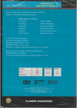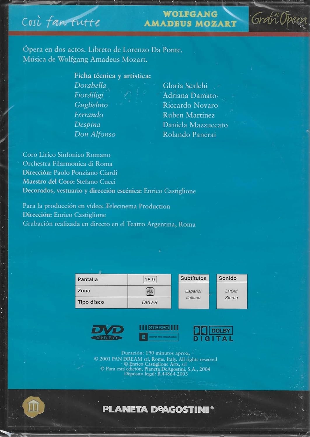 Disfruta de una de las obras maestras de Mozart con esta magnífica producción de 'Così fan tutte' en DVD, parte de la prestigiosa colección La Gran Ópera de Planeta DeAgostini. Esta ópera en dos actos, con libreto de Lorenzo Da Ponte, fue grabada en directo en el Teatro Argentina de Roma, presentando un elenco estelar que incluye a Gloria Scalchi, Riccardo Novaro y Rolando Panerai, bajo la dirección musical del maestro Paolo Ponziano Ciardi. La producción cuenta con el Coro Lírico Sinfónico Romano y la Orchestra Filarmonica di Roma, ofreciendo una experiencia audiovisual de alta calidad con formato 16:9, sonido LPCM estéreo y Dolby Digital. Con una duración aproximada de 190 minutos, el DVD incluye subtítulos en español e italiano para mayor accesibilidad. La dirección escénica y el decorado, a cargo de Enrico Castiglione, complementan perfectamente esta representación de una de las óperas más célebres del repertorio clásico.
