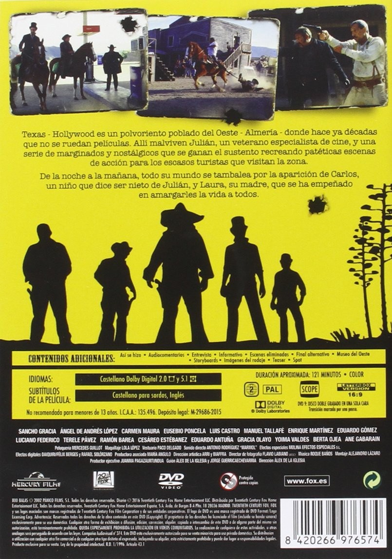 https://dvdstorespain.es/es/outlet-dvd-blu-ray-y-cd/46127-800-balas-dvd-2002-8420266976574.html46127800 Balas [DVD] (2002)Almería, desierto de Tabernas, año 2002. Texas Hollywood es un polvoriento poblado del Oeste donde hace ya décadas que no se ruedan películas. Allí malvive Julián (Sancho Gracia), un veterano especialista de cine que está de vuelta de todo. Con él trabajan otros marginados y nostálgicos sin remedio: Cheyen (Ángel de Andrés), el pistolero cobarde; Manuel (Manuel Tallafé), el doble temerario; Arrastrao (Enrique Martínez), el jinete sin suerte; Ahorcado (Eduardo Gómez), el colgado triste; Enterrador (Luciano Federico), el italiano gafado; Don Mariano (Ramón Barea), el dueño del poblado... y media docena de gitanos disfrazados de indios. Se ganan la vida recreando patéticas escenas de acción para los escasos turistas guiris que visitan la zona. De la noche a la mañana, la vida de estos pobres diablos da un vuelco con la aparición de Carlos (Luis Castro), un niño que asegura ser nieto de Julián. Mientras Rocío (Terele Pávez), la abuela del crío, se desespera en su chalet de dos plantas, la madre, Laura (Carmen Maura), una ejecutiva agresiva, decide enfrentarse a los fantasmas del pasado con el apoyo incondicional -e interesado- de su socio Scott (Eusebio Poncela), un tiburón de las finanzas. A partir de ese momento, las heridas mal cicatrizadas se combinan con la especulación inmobiliaria en una tormenta tragicómica de imprevisibles consecuencias.https://dvdstorespain.es/503633-home_default/800-balas-dvd-2002.jpg1.1694instockSogepaq5.16941.169477.37841915889742018-10-24T22:40:42+0200/Inicio/Inicio/DVD/Inicio/Películas/Inicio/Outlet DVD, Blu-Ray y CD/Inicio/Nuevos/Inicio/VELADA SP 70/Inicio/VELADA DE 100/Inicio/VELADA FR 100/Inicio/VELADA IT 100/Inicio/Homenaje a Eusebio Poncela