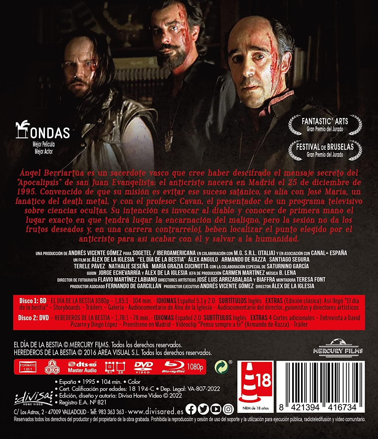 6 Premios Goya: Mejor Director | Mejor Actor Revelación | Mejor Dirección Artística | Mejor Maquillaje y Peluquería | Mejor Sonido | Mejores Efectos Especiales Ángel Berriartúa es un sacerdote vasco que cree haber descifrado el mensaje secreto del "Apocalipsis" de san Juan Evangelista: el anticristo nacerá en Madrid el 25 de diciembre de 1995. Convencido de que su misión es evitar ese suceso satánico, se alía con José María, un fanático del death metal, y con el profesor Cavan, el presentador de un programa televisivo sobre ciencias ocultas. Su intención es invocar al diablo y conocer de primera mano el lugar exacto en que tendrá lugar la encarnación del maligno, pero la sesión no da los frutos deseados y, en una carrera contrarreloj, beben localizar el punto elegido por el anticristo para así acabar con él y salvar a la humanidad. Extras: Entrevistas con el director y los actores / Videoclips del rodaje / Teaser / Galería Imagen: 1,85:1 Región del disco: Todas las Regiones (A, B, C) Disco 1: BD - EL DÍA DE LA BESTIA 1080p ? 1,85:1 - 104 min. - IDIOMAS Español 5.1 y 2.0 SUBTÍTULOS Inglés EXTRAS (Edición clásica): Así llegó "El día de la bestia" ? Storyboards ? Tráilers ? Galería - Audiocomentario de Álex de la Iglesia - Audiocomentario del director, guionistas y directores artísticos Disco 2: DVD ? HEREDEROS DE LA BESTIA ? 1,78:1 - 78 min. - IDIOMAS Español 2.0 SUBTÍTULOS Inglés EXTRAS 4 Cortes adicionales ? Entrevista a David Pizarro y Diego López ? Preestreno en Madrid ? Videoclip "Penso sempre a te" (Armando de Razza) - Tráiler