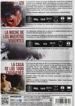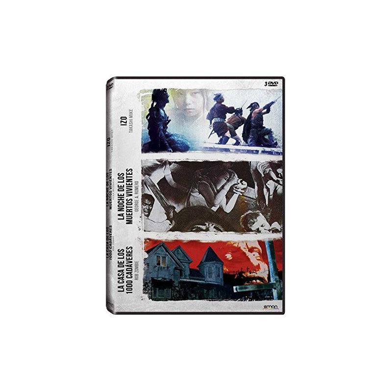 https://dvdstorespain.es/es/peliculas/102726-pack-zombie-romero-miike-la-casa-de-los-1000-cadaveres-la-noche-de-los-muertos-vivientes-izo-dvd--8435153744716.html102726Pack: Zombie + Romero + Miike (La Casa De Los 1000 Cadáveres + La Noche De Los Muertos Vivientes + Izo) [DVD]<div id="productDescription" class="a-section a-spacing-small"> <!-- show up to 2 reviews by default --><br /><p> <span>- Izo:<br />El grito de Izo resuena en el lugar de la ejecución, acaba de ser ejecutado acusado de un asesinato. Muere, pero deja una profunda maldición. Su alma no puede ir al cielo ni al infierno y quedará flotando en el espacio y en el tiempo. Años después, un vagabundo aparece entre los edificios. Es la reencarnación de Izo y tiene un claro objetivo: matar. Una voz le dice: "Eres un asesino nato. Eres el mal hecho hombre". <br /><br />- La Noche de los Muertos Vivientes:<br /> Las radiaciones emitidas por la caída de un satélite provocan que los recientes difuntos surjan de sus tumbas. Entre la confusión y el pánico, un grupo de supervivientes se refugia en una granja en la que se desatará una difícil lucha por sobrevivir. <br /><br />- La Casa de los 1.000 Cadáveres:<br />Es la noche de Halloween de 1977. Un contratiempo en el coche obliga a Jerry, Mary y Bill a pararse en una gasolinera de una carretera secundaria. No es una gasolinera cualquiera, está dirigida por el capitán Spaulding quién además es el propietario del museo de Monstruos y Locos. Después de las historias y hazañas de algunos de los principales asesinos en serie. Bill convence a sus amigos para investigar un poco más la historia del Dr. Satán. En plena noche y en medio de la lluvia conocerán a una extraña y peculiar pareja.</span> </p> </div>https://dvdstorespain.es/601289-home_default/pack-zombie-romero-miike-la-casa-de-los-1000-cadaveres-la-noche-de-los-muertos-vivientes-izo-dvd-.jpg8.1818instockDEAPLANETA8.18188.1818002023-02-02T02:12:02+0100/Inicio/Inicio/DVD/Inicio/Películas/Inicio/Nuevos
