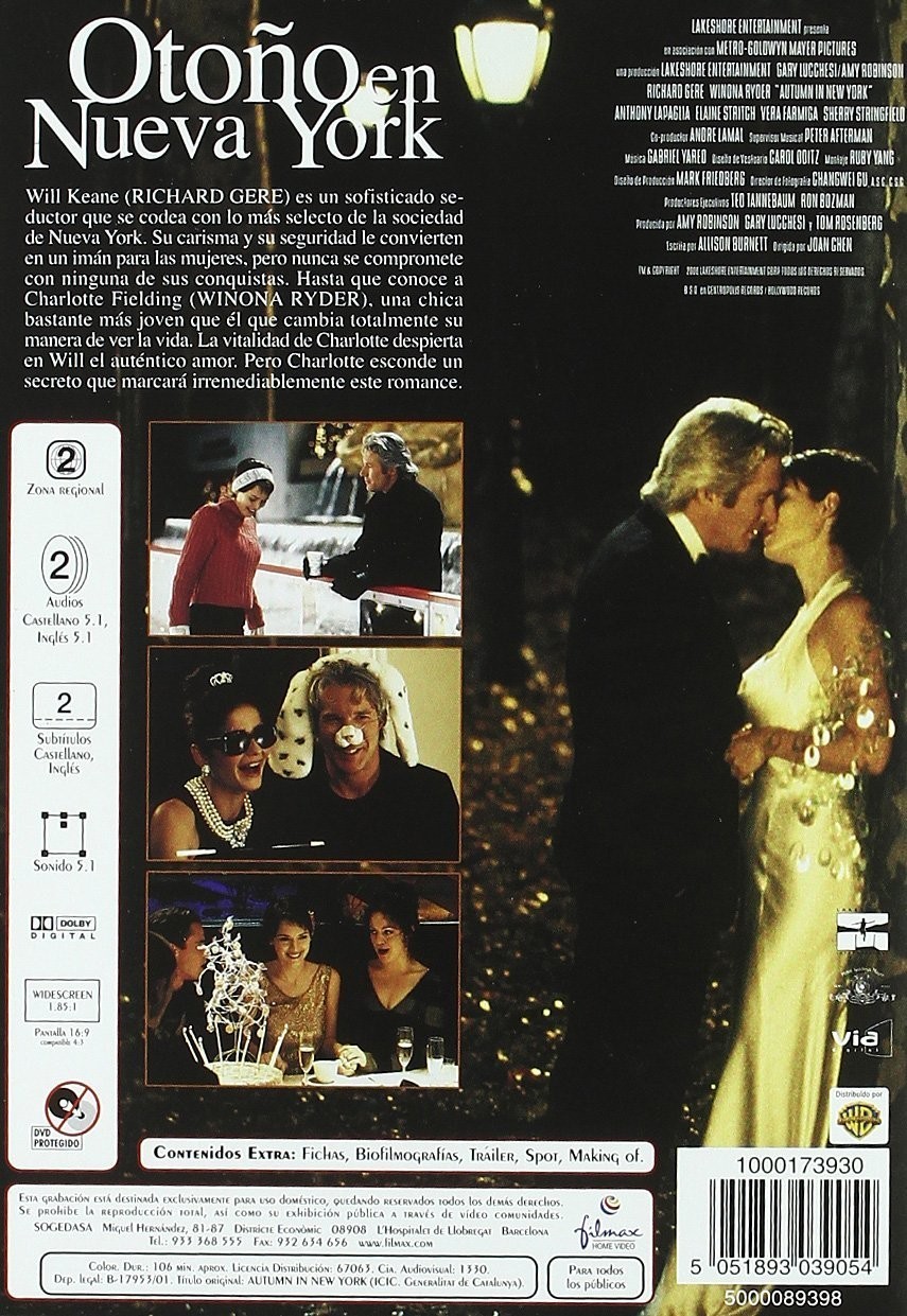https://dvdstorespain.es/es/peliculas/104200-otono-en-nueva-york-dvd-2000-autumn-in-new-york-5051893039054.html104200Otoño en Nueva York [DVD] 2000 Autumn in New York<div id="productDescription" class="a-section a-spacing-small"> <!-- show up to 2 reviews by default --><br /><p> <span>Will Keane es el propietario de uno de los más excelentes restaurantes de Nueva York, frecuentado por la sociedad más selecta. El carisma y la seguridad de Will le convierten en un imán para las mujeres, a quienes frecuenta sin comprometerse. Es decir, hasta que conoce a Charlotte Fielding. Es un choque entre el niño y la mujer: su pasión por la vida le hechiza de inmediato. Aparentemente un soltero feliz, las contagiosas ganas de vivir de ella cambian a Will Keane para siempre...</span> </p> </div>https://dvdstorespain.es/671050-home_default/otono-en-nueva-york-dvd-2000-autumn-in-new-york.jpg4.6281instock4.62814.6281002023-02-28T01:12:06+0100/Películas