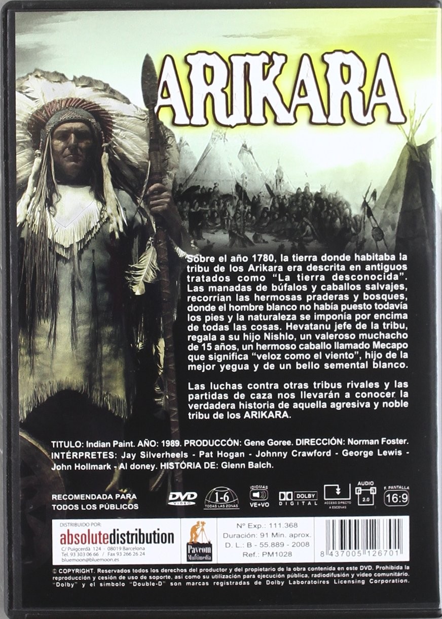 España Edition, PAL/Region 0 DVD: IDIOMAS: Español ( Dolby Digital 2.0 ), Inglés ( Dolby Digital 2.0 ), WIDESCREEN (1.78:1), EXTRAS: Acceso De la Escena, Menú Interactivo, SYNOPSIS: Sobre el año 1780, la tierra donde habitaba la tribu de los Arikara era descrita en antiguos tratados como "La tierra desconocida". Las manadas de búfalos y caballos salvajes, recorrían las hermosas praderas y bosques, donde el hombre blanco no había puesto todavía los pies y la naturaleza se imponía por encima de todas las cosas. ...Arikara / Indian Paint