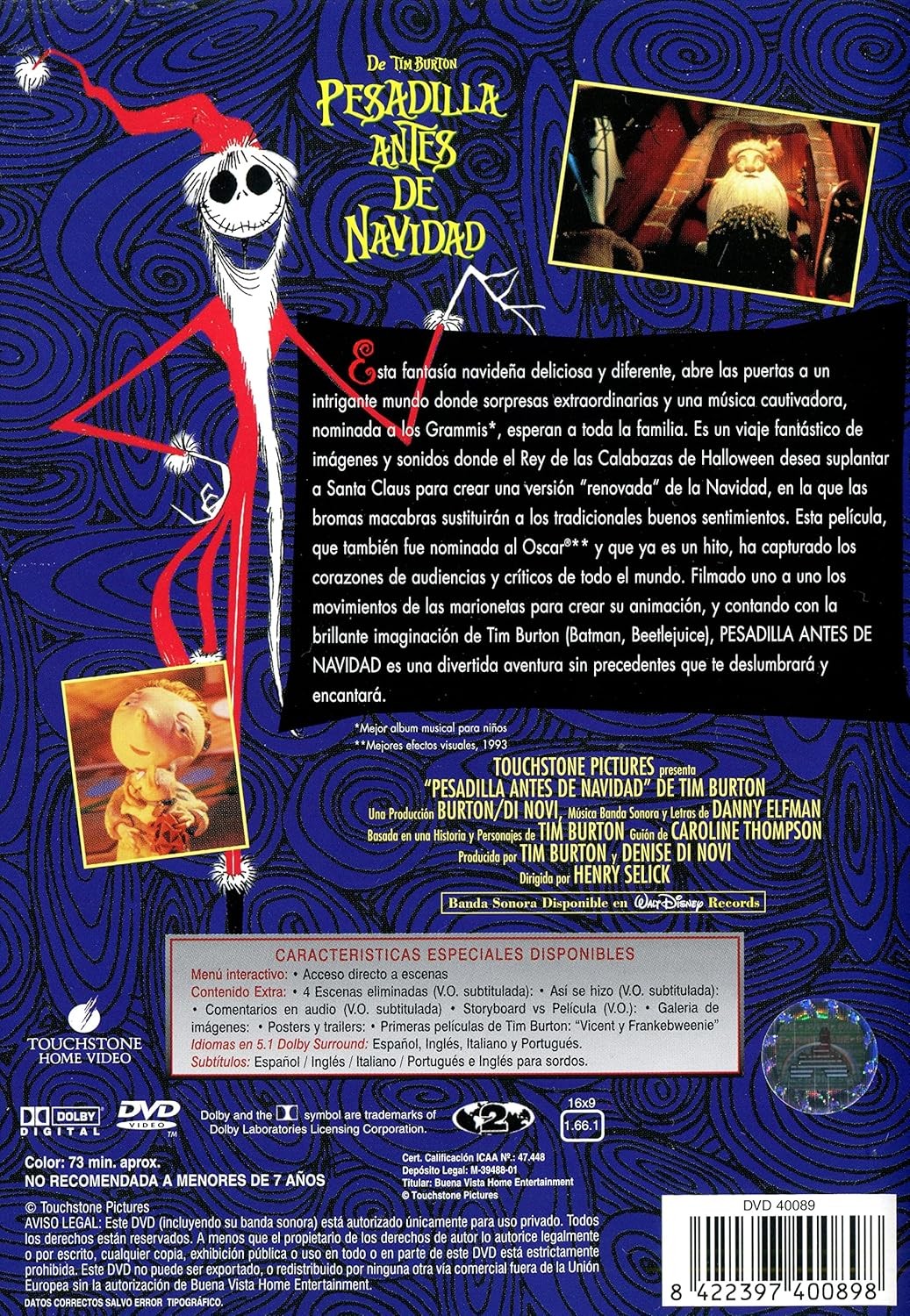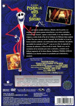 Año 1993 / Duración 75 min. / Dirección: Henry Selick / Guion: Caroline Thompson, Michael McDowell. / Historia: Tim Burton / Reparto: Animación / Productor: Tim Burton / Sinopsis: Cuando Jack Skellington, el Señor de Halloween, descubre la Navidad, se queda fascinado y decide mejorarla. Sin embargo, su visión de la festividad es totalmente contraria al espíritu navideño. Sus planes incluyen el secuestro de Santa Claus y la introducción de cambios bastante macabros. Sólo su novia Sally es consciente del error que está cometiendo.