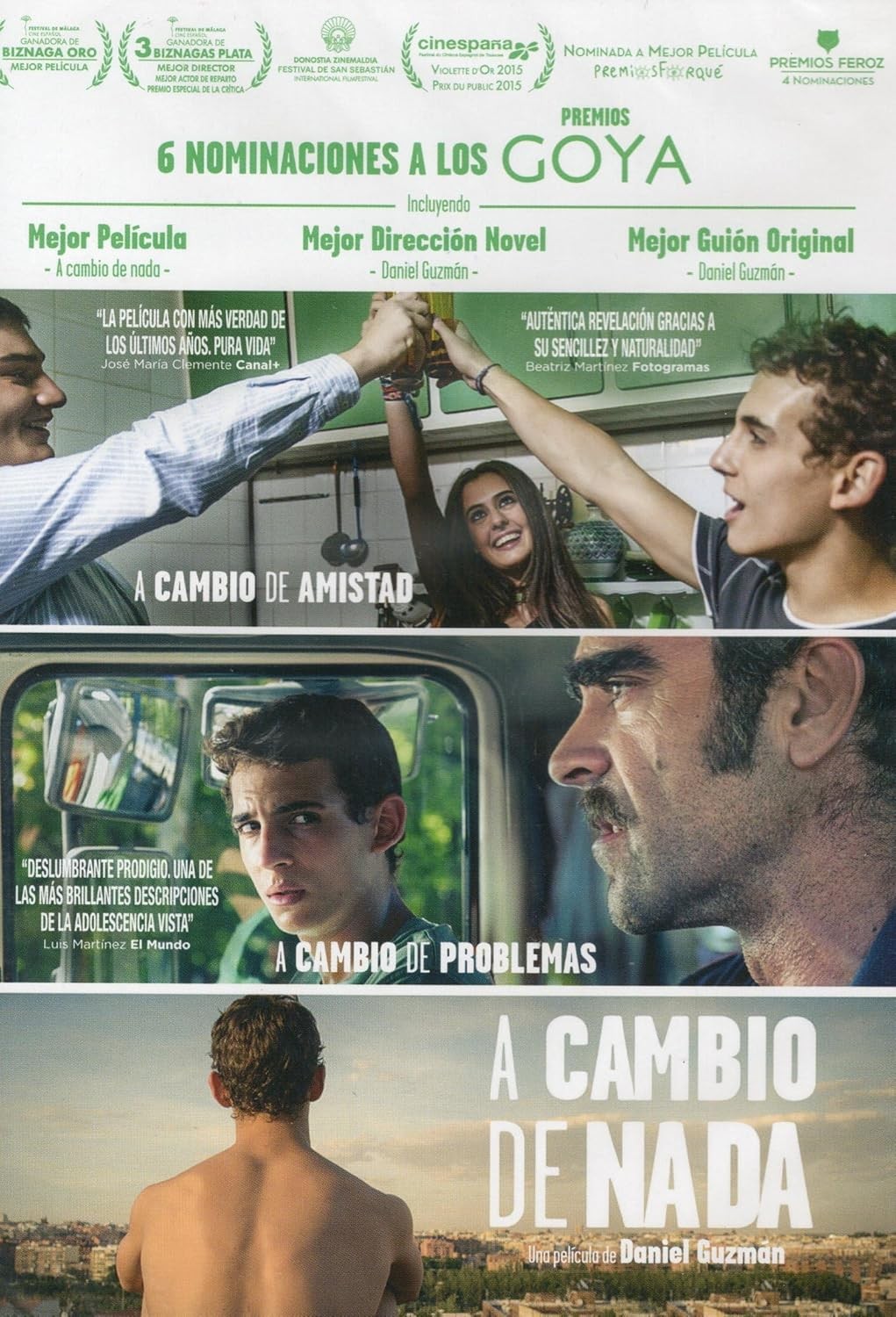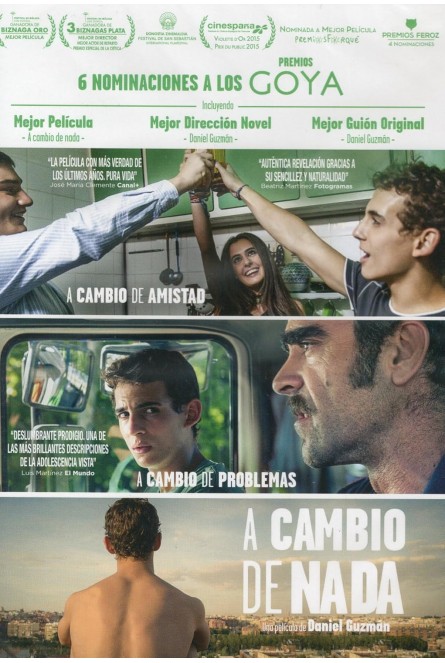 https://dvdstorespain.es/es/peliculas/121123-a-cambio-de-nada-dvd-edicion-slim-0605848971941.html121123A Cambio De Nada (Edición slim) [DVD] (2015)Darío, un chico de dieciséis años, disfruta de la vida con Luismi, su vecino y amigo del alma. Mantienen una amistad incondicional, se conocen desde niños y juntos han descubierto todo lo que saben de la vida. Tras la separación de sus padres, Darío huye de casa y empieza a trabajar en el taller de Caralimpia, un viejo delincuente con aires de triunfador, que le enseña el oficio y los beneficios de la vida. Darío conoce además a Antonia, una anciana que recoge muebles abandonados con su motocarrro. A su lado descubre otra forma de ver la vida. Luismi, Caralimpia y Antonia se convierten en su nueva familia durante un verano que les cambiará la vida. https://dvdstorespain.es/678417-home_default/a-cambio-de-nada-dvd-edicion-slim.jpg4.6281instockResearch4.62814.6281002025-02-25T22:33:48+0100/Películas
