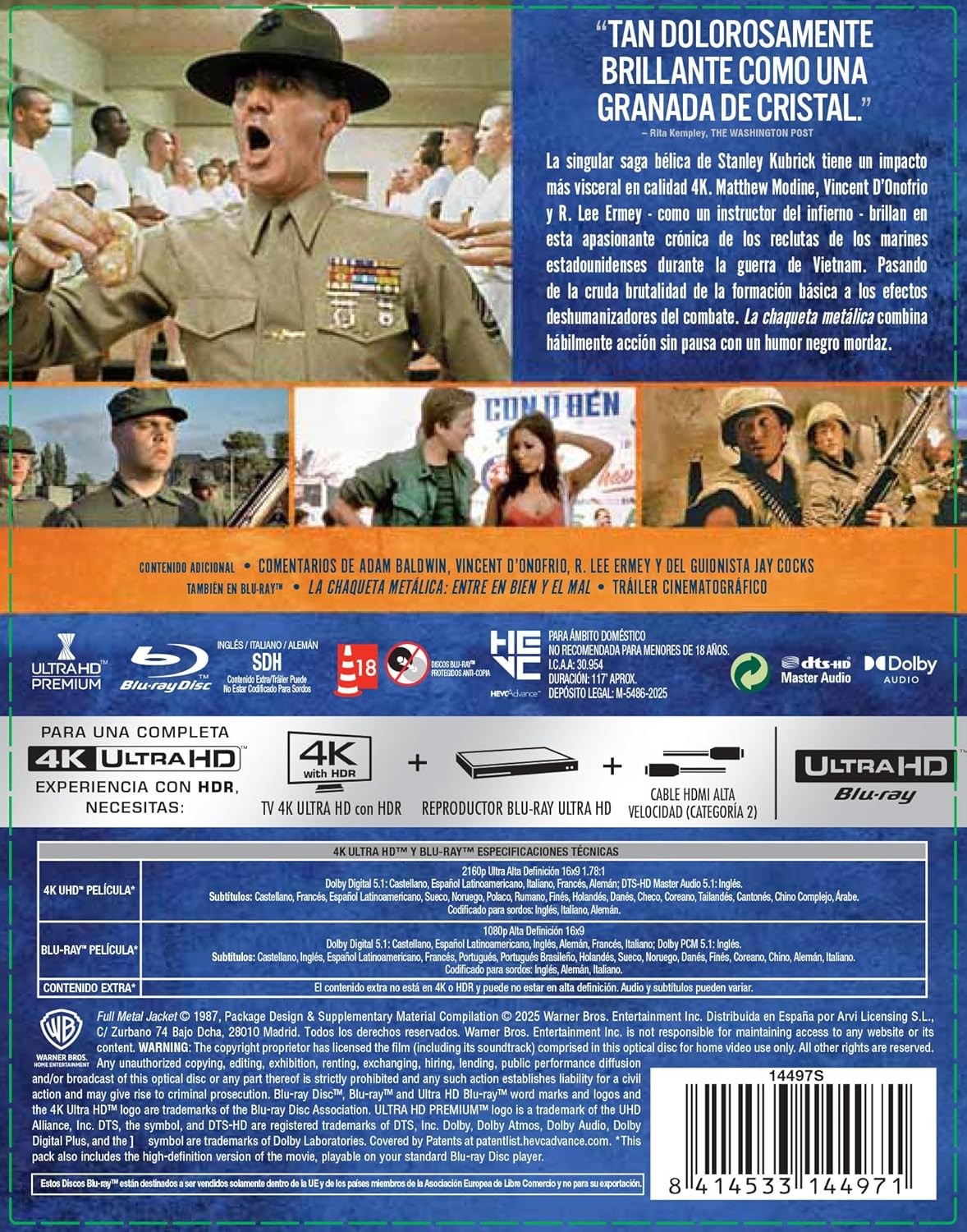 https://dvdstorespain.es/es/peliculas/121996-la-chaqueta-metalica-edicion-especial-metalica-limitada-hasta-agotar-existencias-4k-uhdblu-ray-1987-full-metal-jacket-8414533144971.html121996La Chaqueta Metálica (Edición especial Metálica, Limitada hasta fin de existencias) [4K UHD,Blu-ray] (1987) Full Metal JacketUn grupo de reclutas se prepara en Parris Island, centro de entrenamiento de la marina norteamericana. Están bajo las órdenes del sargento Hartman, duro e implacable, cuya única misión en la vida es endurecer el cuerpo y el alma de los novatos, con el objetivo de que en el futuro puedan defenderse del enemigo. Pero no todos los jóvenes están preparados para soportar sus métodos.https://dvdstorespain.es/1042920-home_default/la-chaqueta-metalica-edicion-especial-metalica-limitada-hasta-agotar-existencias-4k-uhdblu-ray-1987-full-metal-jacket.jpg32.1488instockARVI32.148832.1488002025-03-20T23:58:55+0100/Inicio/Inicio/Películas/Inicio/Nuevos/Inicio/4K-UHD