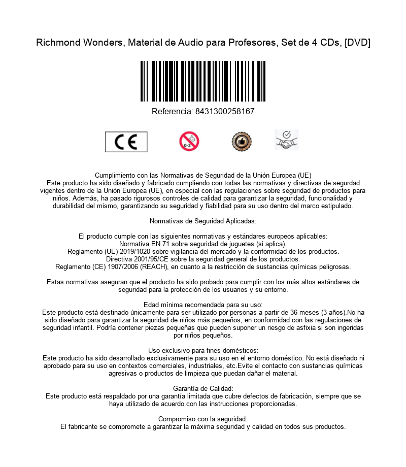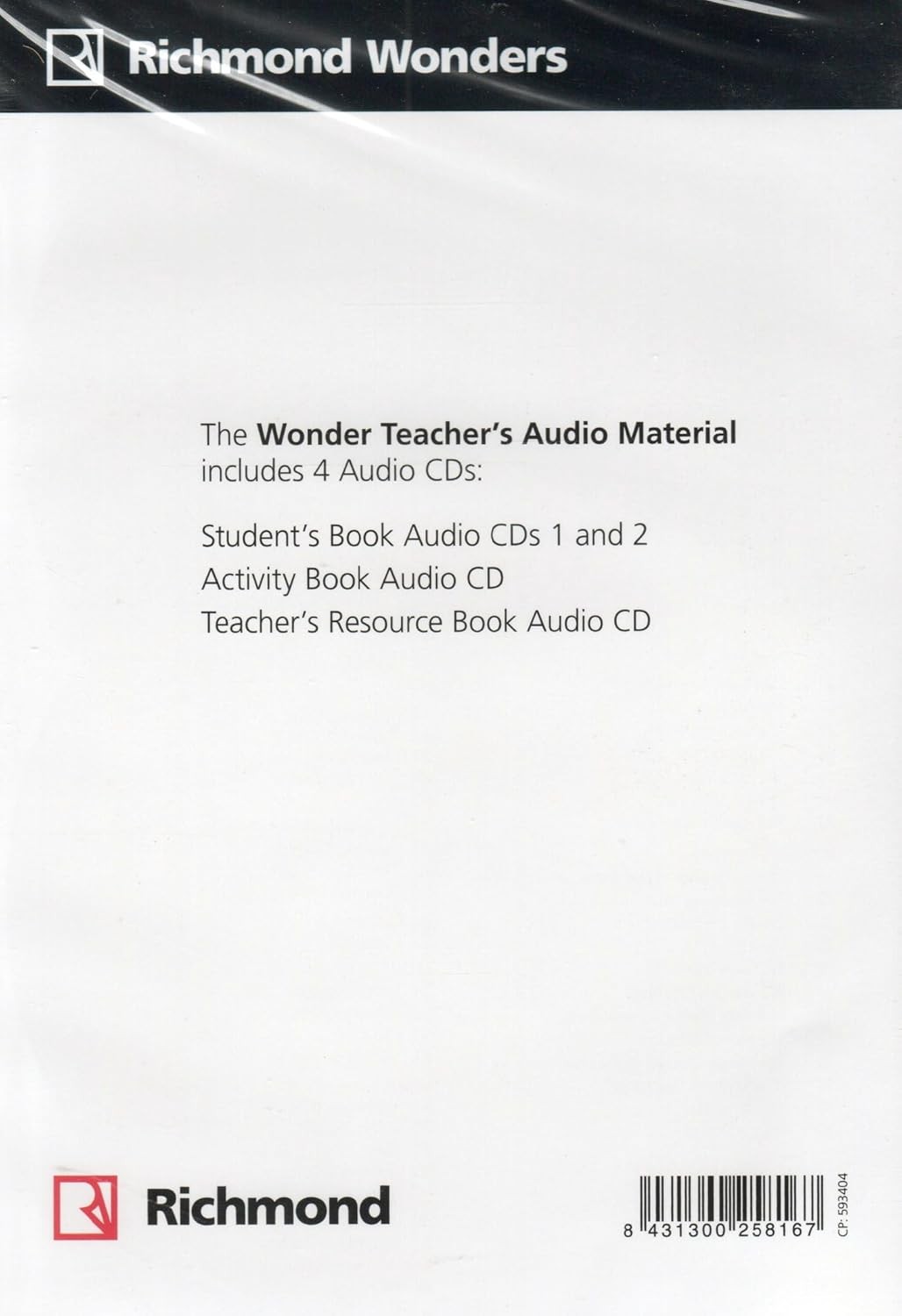 Descubre el completo conjunto de material de audio Wonder Teacher's de Richmond, diseñado específicamente para enriquecer la experiencia educativa. Este paquete integral incluye 4 CDs de audio cuidadosamente estructurados: dos CDs para el libro del estudiante que complementan el aprendizaje en clase, un CD dedicado al libro de actividades que facilita la práctica independiente, y un CD especial para el libro de recursos del profesor que optimiza la planificación de las lecciones. Cada componente ha sido desarrollado para maximizar la comprensión auditiva y mejorar las habilidades lingüísticas de los estudiantes. Este material audiovisual es una herramienta esencial para crear un ambiente de aprendizaje dinámico e interactivo, permitiendo a los profesores implementar estrategias pedagógicas efectivas mientras los estudiantes desarrollan sus competencias lingüísticas de manera natural y progresiva.
