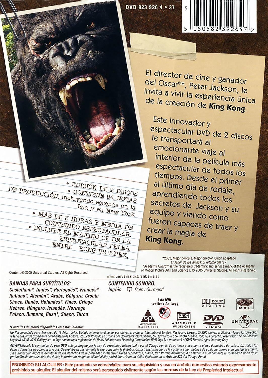 El director de cine y ganador del Oscar, Peter Jackson, le invita a vivir la experiencia única de la creación de King Kong. Este innovador y espectacular DVD de 2 discos le transportará al emocionante viaje al interior de la película más espectacular de todos los tiempos. Desde el primer al último día de rodaje, aprendiendo todos los secretos de Jackson y su equipo y viendo cómo fueron capaces de traer y crear la magia de King Kong.. Extras Menús interactivos, Acceso directo a escenas, Contiene 52 notas de producción, incluyendo escenas en la Isla y en Nueva York, Making of de la espectacular pelea entre Kong Vs T-Rex