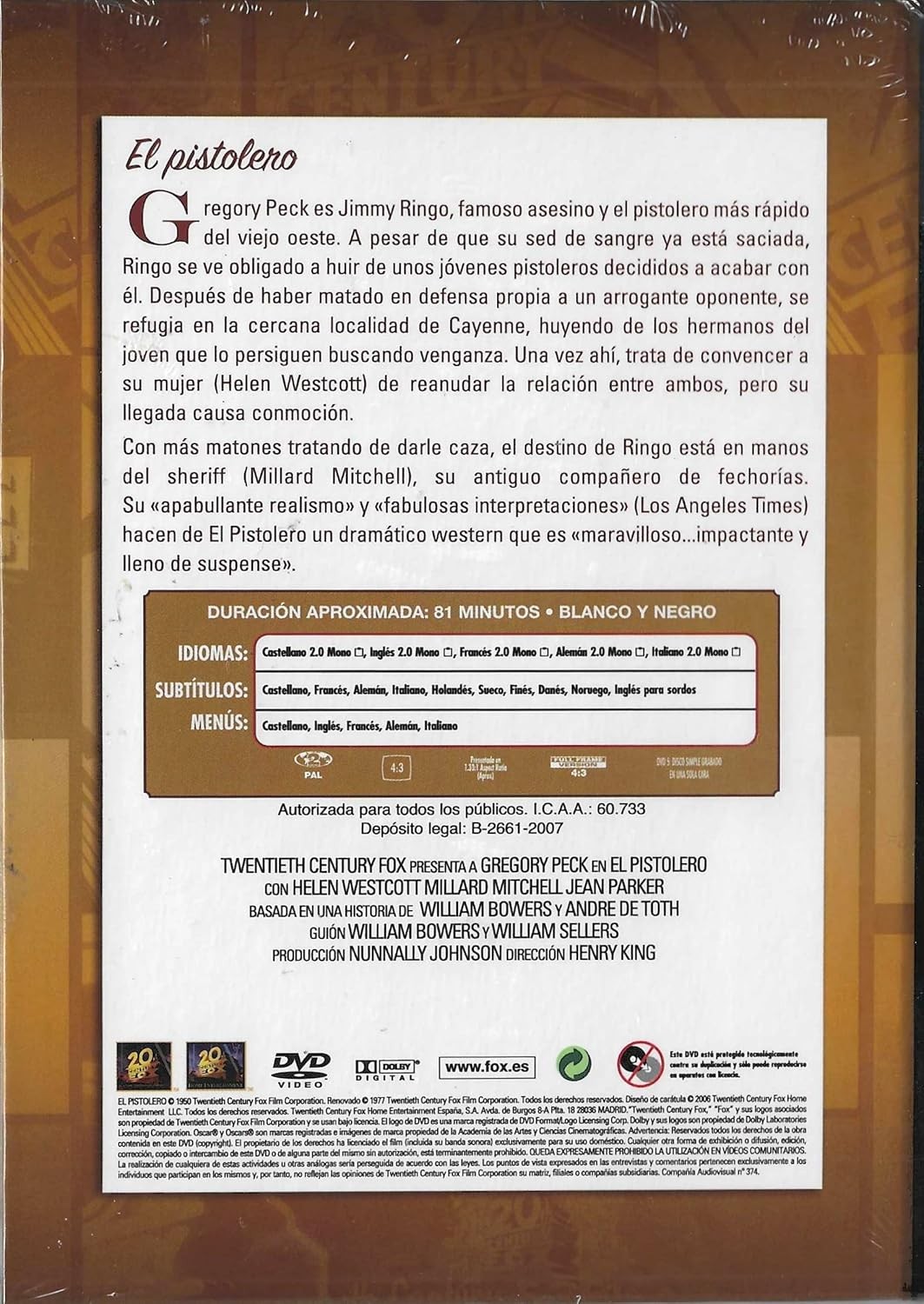 Descubre 'El Pistolero', un clásico western en blanco y negro de 81 minutos presentado por Twentieth Century Fox. Esta edición especial forma parte de la prestigiosa colección 'El Mejor Cine del Oeste' en formato DVD. La película narra la historia de Jimmy Ringo, un legendario pistolero del viejo oeste que busca escapar de su violento pasado. Con una trama llena de acción y drama, la película destaca por su realismo y actuaciones memorables que mantienen al espectador en constante suspense. Esta edición incluye múltiples opciones de audio en Castellano 2.0 Mono, Inglés, Francés, Alemán e Italiano, además de una amplia selección de subtítulos que incluyen Castellano, Francés, Alemán, Italiano, Holandés, Sueco, Finés, Danés, Noruego e inglés para sordos. El DVD viene presentado en una elegante edición libro que complementa esta obra maestra del género western, autorizada para todos los públicos.