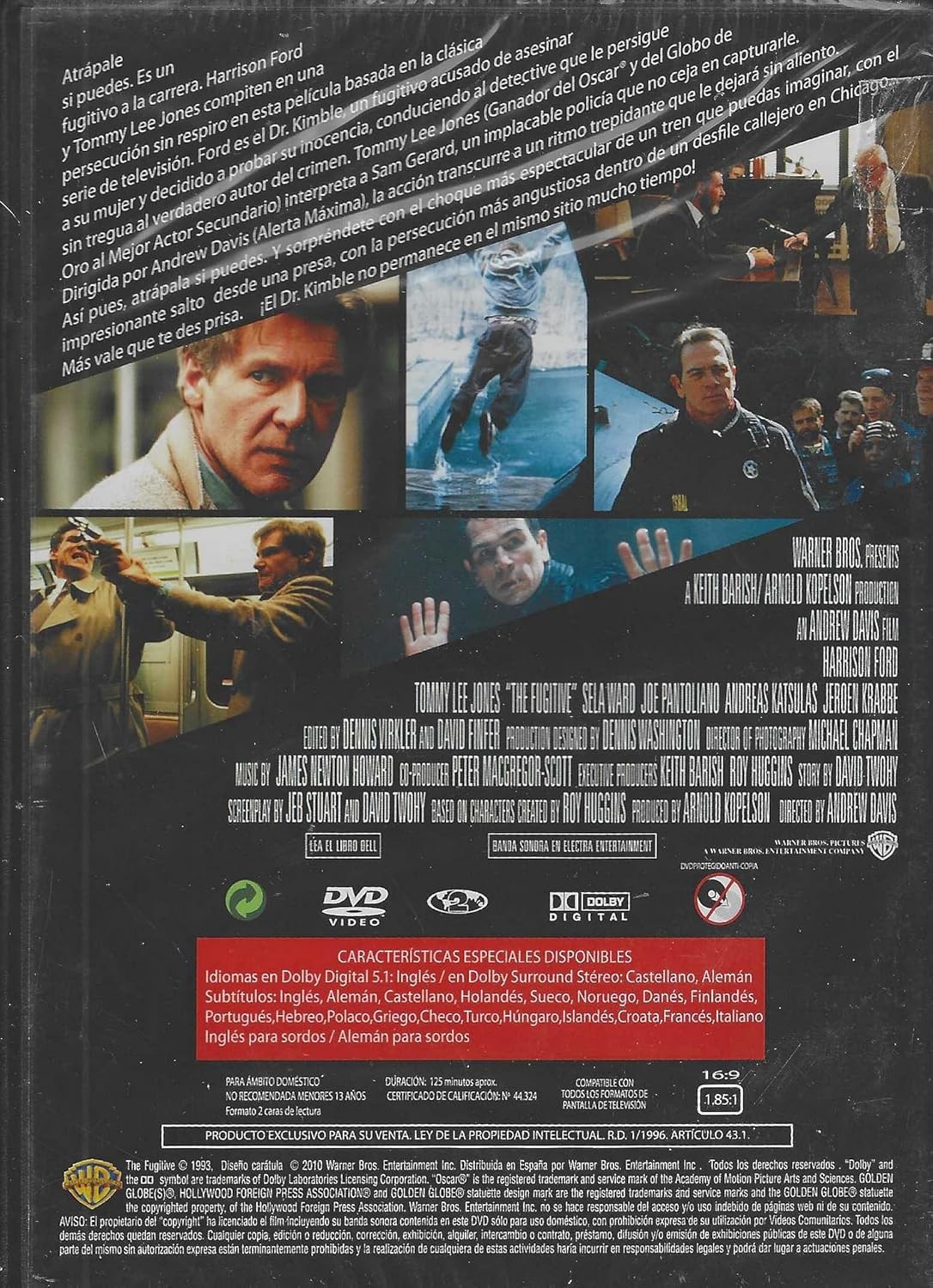 Experimenta la emoción del thriller clásico 'El Fugitivo' en DVD, distribuido por Warner Bros Entertainment. Esta película de acción intensa sigue una trama apasionante llena de giros inesperados. El DVD incluye características especiales con audio en Dolby Digital 5.1 en inglés y Dolby Surround Stereo en castellano y alemán. Cuenta con una amplia selección de subtítulos en múltiples idiomas incluyendo inglés, alemán, castellano, holandés, sueco, noruego, danés, finlandés, portugués, hebreo, polaco, griego, checo, turco, húngaro, islandés, croata, francés e italiano. También dispone de subtítulos para sordos en inglés y alemán. Con una duración aproximada de 125 minutos, esta película no recomendada para menores de 13 años se presenta en formato panorámico 16:9 (1.85:1) y es compatible con todos los formatos de pantalla de televisión. Un producto exclusivo que combina calidad técnica superior con una historia cautivadora que te mantendrá al borde del asiento.