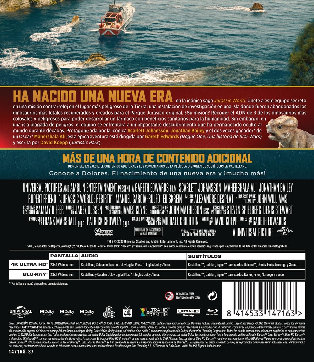 https://dvdstorespain.es/es/peliculas/126888-jurassic-world-el-renacer-uhdbd-blu-ray--8414533147163.html126888Jurassic World: El Renacer [4K UHD, Blu-ray ] (2025) Jurassic World RebirthCinco años después de los acontecimientos de Jurassic World Dominion, en la Tierra quedan pocos dinosaurios que viven en regiones ecuatoriales donde el clima se parece al de antaño. Las tres criaturas más grandes de esta biosfera tropical tienen en su ADN la clave para fabricar un medicamento que aportará grandes beneficios medicinales a la raza humana. Zora Bennett, una experta en operaciones encubiertas, es contratada para dirigir a un equipo de especialistas cuya misión es conseguir el material genético, pero los miembros de la operación acaban en una isla prohibida donde se ubicó hace años un centro de investigación secreto del Parque Jurásico. Allí, en un lugar poblado por dinosaurios de numerosas especies, se enfrentarán a un descubrimiento tan sorprendente como siniestro que lleva décadas escondido. https://dvdstorespain.es/1082127-home_default/jurassic-world-el-renacer-uhdbd-blu-ray-.jpg22.2314instockARVI22.231422.2314002025-09-26T19:30:23+0200/Inicio/Inicio/Películas/Inicio/Nuevos/Inicio/4K-UHD