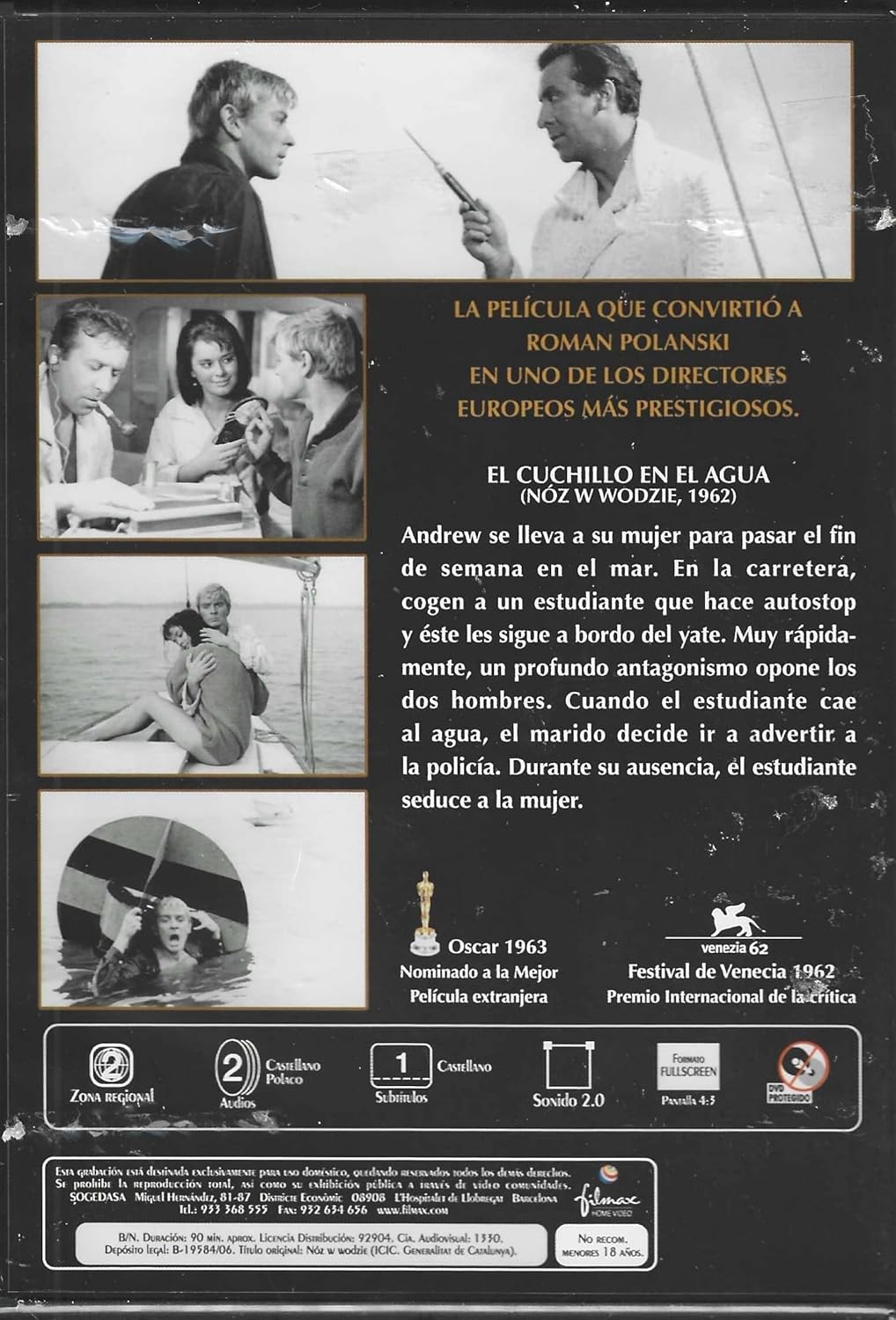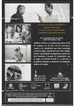 El Cuchillo en el Agua (Nóż w wodzie, 1962) es una obra maestra del cine europeo distribuida por Hollywood Classics. Esta película en blanco y negro, que catapultó a Roman Polanski como uno de los directores europeos más prestigiosos, narra una intensa historia de tensión psicológica a bordo de un yate. La trama se desarrolla cuando una pareja que viaja para pasar un fin de semana en el mar recoge a un joven autoestopista, desencadenando un triángulo de antagonismo y seducción. La película recibió reconocimiento internacional, incluyendo una nominación al Oscar como Mejor Película Extranjera en 1963 y el Premio Internacional de la Crítica en el Festival de Venecia 1962. Esta edición en DVD presenta la película en formato pantalla completa 4:3, con sonido 2.0 y zona regional 2. Con una duración aproximada de 90 minutos, esta obra fundamental del cine europeo destaca por su narrativa tensa y atmósfera claustrofóbica. No recomendada para menores de 18 años.