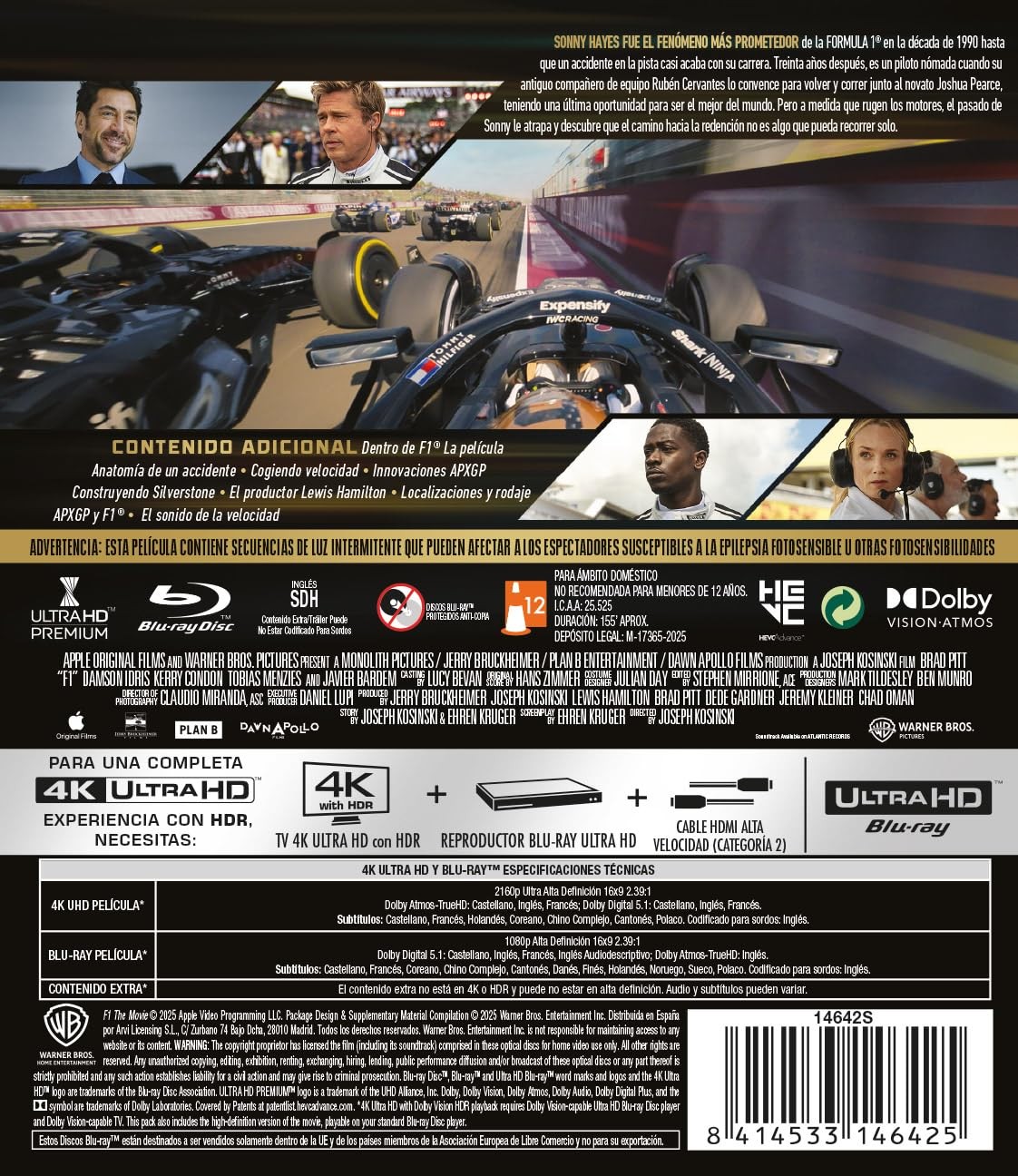 https://dvdstorespain.es/es/peliculas/126903-f1-la-pelicula-4k-uhdbd-blu-ray--8414533146425.html126903F1: La Película [4K UHD, Blu-ray ] (2025) F1: The MovieSonny Hayes fue el fenómeno más prometedor de la Fórmula 1 en la década de 1990, hasta que un accidente en la pista acabó prácticamente con su carrera. Treinta años después es un piloto nómada a sueldo al que contacta su antiguo compañero de equipo, Rubén Cervantes, propietario de un equipo de Fórmula 1 al borde de la quiebra. Rubén convence a Sonny para volver a la categoría reina del automovilismo y tener una última oportunidad para salvar al equipo. Su compañero será el novato Joshua Pearce, el piloto estrella del equipo, que está decidido a imponer su propio ritmo.https://dvdstorespain.es/1082505-home_default/f1-la-pelicula-4k-uhdbd-blu-ray-.jpg22.2314instockARVI22.231422.2314002025-09-27T02:30:18+0200/Inicio/Inicio/Películas/Inicio/Nuevos/Inicio/4K-UHD