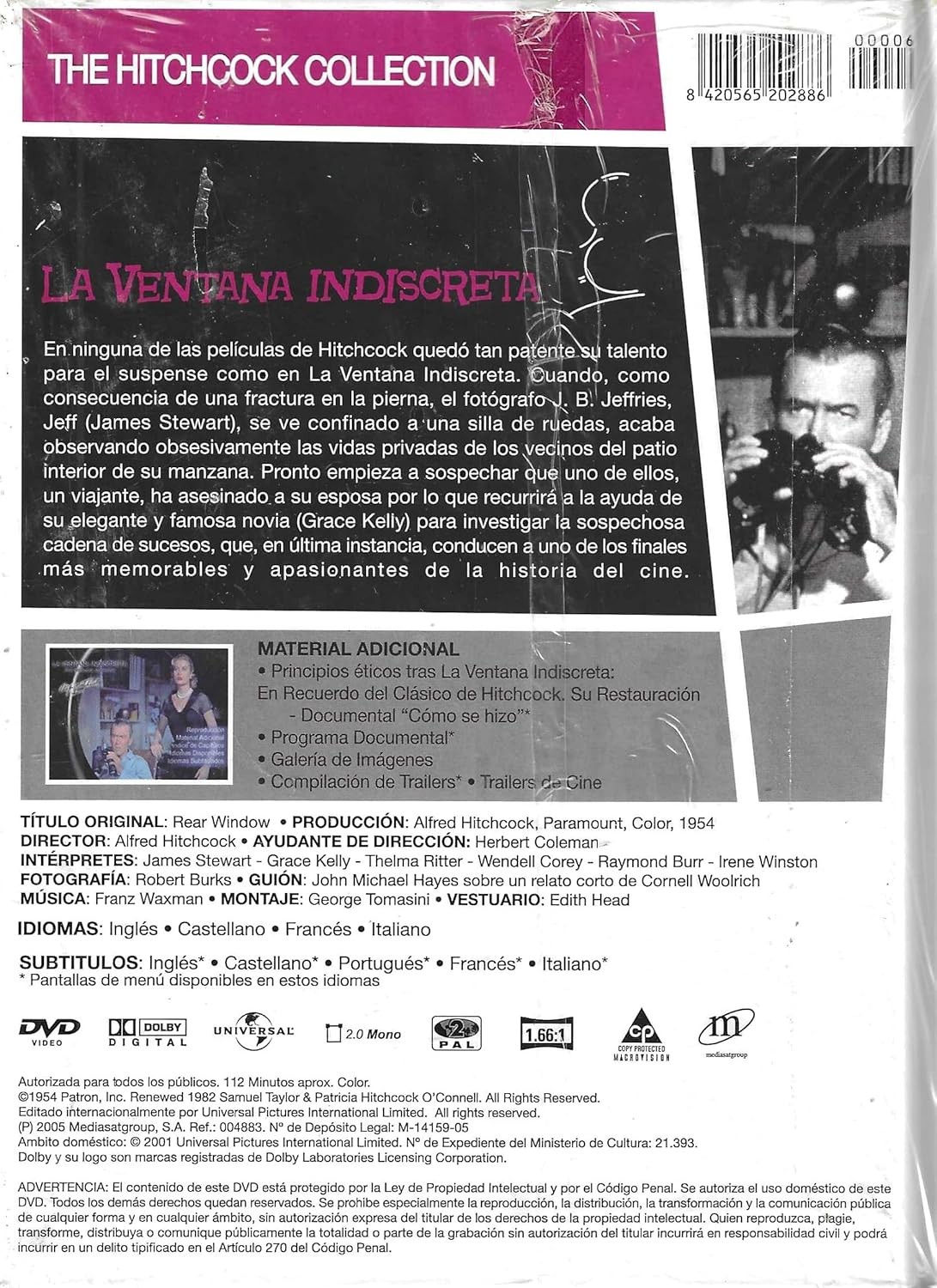 Descubre 'La Ventana Indiscreta' en esta prestigiosa edición de The Hitchcock Collection en DVD. Esta obra maestra del suspense de 1954, distribuida por Universal, presenta una narrativa cautivadora sobre un fotógrafo confinado a una silla que observa misteriosamente las vidas de sus vecinos, desentrañando un posible crimen. La película, dirigida magistralmente por Alfred Hitchcock, cuenta con un elenco estelar y una trama que mantiene al espectador al borde del asiento. Esta edición especial incluye material adicional fascinante como documentales sobre la restauración de la película, principios éticos detrás de su realización, galería de imágenes y una compilación de tráilers. Disponible con audio en inglés, castellano, francés e italiano, y subtítulos en múltiples idiomas. La duración aproximada es de 112 minutos, presentada en color y con calidad de imagen y sonido Dolby Digital. Una joya imprescindible para los amantes del cine clásico y coleccionistas.