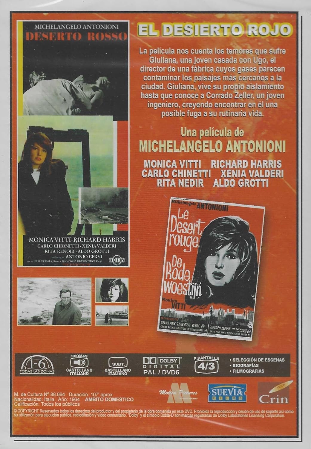 Descubre 'El Desierto Rojo' (Il Deserto Rosso), una obra maestra del cine italiano dirigida por el legendario Michelangelo Antonioni. Esta edición DVD, parte de la prestigiosa Colección Joyas del Cine Italiano de Suevia Films, presenta una restauración digital cuidadosamente realizada. La película, protagonizada por Monica Vitti y Richard Harris, junto a un elenco excepcional que incluye a Carlo Chinetti, Xenia Valderi, Rita Neoir y Aldo Grotti, narra una cautivadora historia sobre la alienación moderna. Con una duración aproximada de 107 minutos, esta obra cinematográfica está disponible en audio italiano con subtítulos en castellano. El DVD incluye características especiales como selección de escenas, biografías y filmografías, presentadas en formato 4:3 PAL con sonido Dolby Digital. Una joya imprescindible para los amantes del cine de autor que representa uno de los momentos más significativos del cine italiano de los años 60.