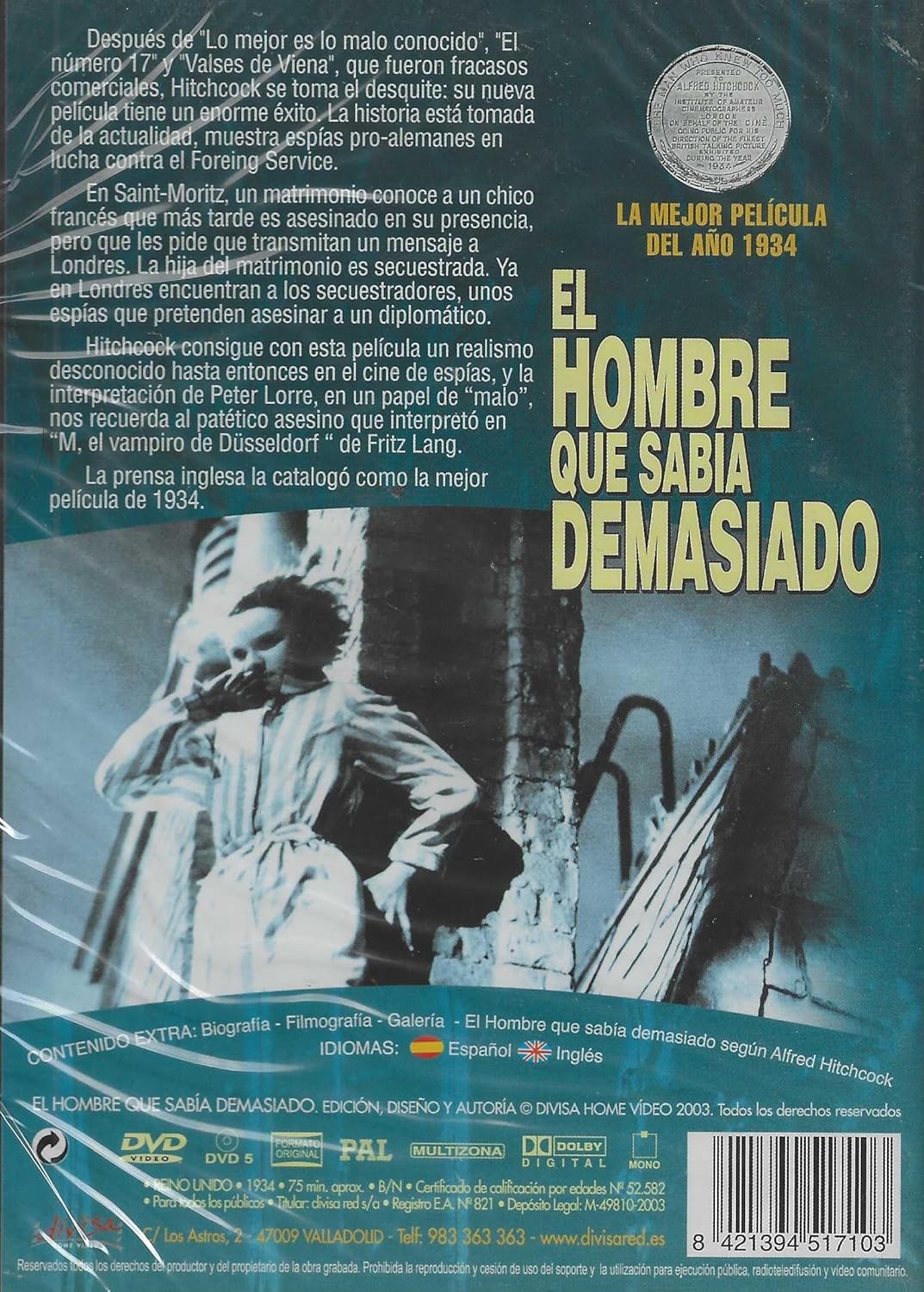 Descubre 'El Hombre que Sabía Demasiado', el clásico thriller de Alfred Hitchcock de 1934 que marcó un hito en el cine de espionaje. Esta obra maestra, galardonada como la mejor película del año 1934 por la prensa inglesa, presenta una trama cautivadora ambientada entre Saint-Moritz y Londres. La película narra una intensa historia de espionaje internacional que involucra secuestros, conspiraciones y un inminente asesinato diplomático. Esta edición en DVD, distribuida por DIVISA, ofrece la película en formato dual con audio en español e inglés, permitiendo disfrutar de las interpretaciones memorables de Leslie Banks, Peter Lorre, Edna Best y Nova Pilbeam. Con una duración aproximada de 75 minutos, esta versión restaurada incluye contenido extra como biografía, filmografía y galería. La película destaca por su innovador realismo en el género de espionaje y una atmósfera de suspense que estableció los cimientos del estilo característico de Hitchcock. Compatible con reproductores de DVD multizona PAL.