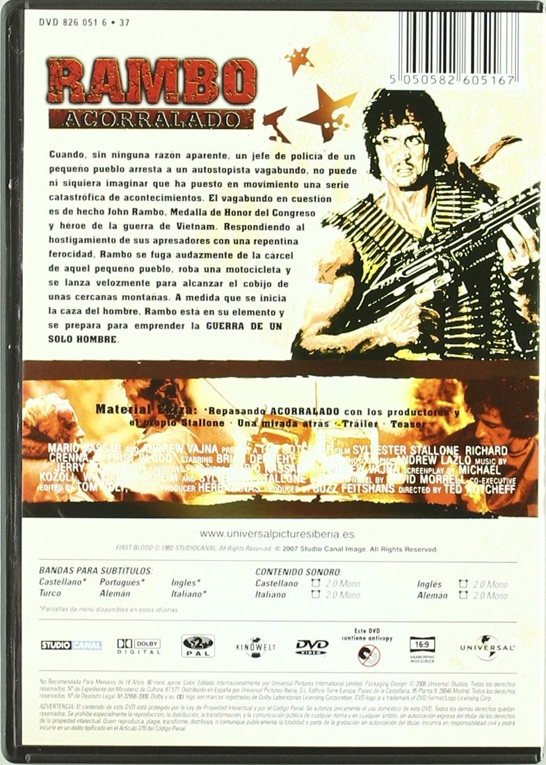 https://dvdstorespain.es/es/peliculas/127353-rambo-acorralado-edicion-especial-dvd-2013--5050582605167.html127353Rambo: Acorralado (Edición especial, 2 discos) [DVD] (1982) Rambo: First BloodCuando John Rambo, un veterano boina verde, va a visitar a un viejo compañero de armas, se entera de que ha muerto víctima de las secuelas de la guerra. Algunos días después, la policía lo detiene por vagabundo y se ensaña con él. Entonces recuerda las torturas que sufrió en Vietnam y reacciona violentamente. https://dvdstorespain.es/1091225-home_default/rambo-acorralado-edicion-especial-dvd-2013-.jpg9.2562instockParamount9.25629.2562002025-10-20T20:16:07+0200/Inicio/Inicio/DVD/Inicio/Películas/Inicio/Nuevos
