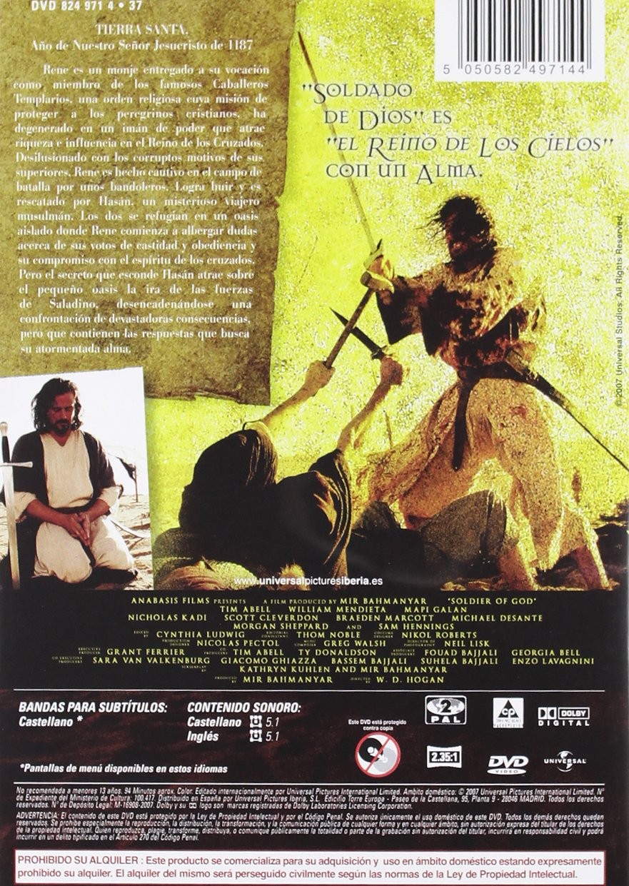 https://dvdstorespain.es/es/peliculas/127359-soldado-de-dios-dvd-2009--5050582497144.html127359Soldado De Dios [DVD] (2005) Soldier of GodTierra Santa. Año de Nuestro Señor Jesucristo de 1187. Rene es un monje entregado a su vocación como miembro de los famosos Caballeros Templarios, una orden religiosa cuya misión de proteger a los peregrinos cristianos ha degenerado en un imán de poder que atrae riqueza e influencia en el Reino de los Cruzados. Desilusionado con los corruptos motivos de sus superiores, Rene es hecho cautivo en el campo de batalla por unos bandoleros. Logra huir y es rescatado por Hasán, un misterioso viajero musulmán. Los dos se refugian en un oasis aislado, donde Rene comienza a albergar dudas acerca de sus votos de castidad y obediencia y su compromiso con el espíritu de los cruzados. Pero el secreto que esconde Hasán atrae sobre el pequeño oasis la ira de las fuerzas de Saladino, desencadenándose una confrontación de devastadoras consecuencias, pero que contienen las respuestas que busca su atormentada alma... https://dvdstorespain.es/1091237-home_default/soldado-de-dios-dvd-2009-.jpg7.2727instockParamount7.27277.2727002025-10-20T20:17:16+0200/Inicio/Inicio/DVD/Inicio/Películas/Inicio/Nuevos