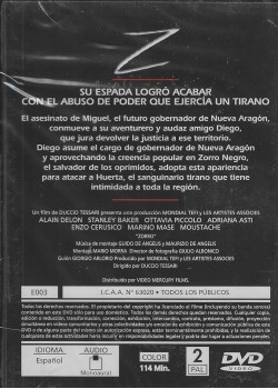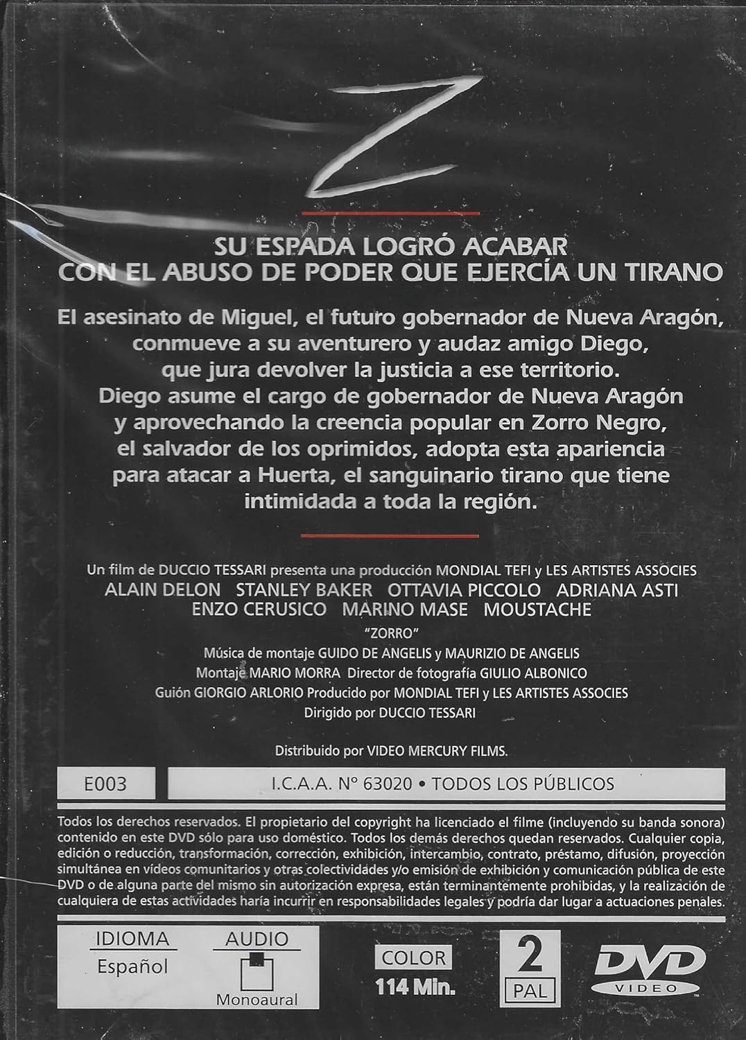 Revive la emocionante aventura del héroe enmascarado en este DVD de 'El Zorro', distribuido por Video Mercury Films. Esta apasionante película de 114 minutos, dirigida por Duccio Tessari, presenta una historia llena de acción y justicia. Cuando Miguel, el futuro gobernador de Nueva Aragón, es asesinado, su amigo Diego asume el papel del legendario Zorro para enfrentar al tirano Huerta, quien mantiene atemorizada a la región. Con un elenco estelar que incluye a Alain Delon y Stanley Baker, esta producción de Mondial Tefi y Les Artistes Associes cautiva con su narrativa épica y escenas de esgrima. El DVD incluye audio monoaural en español y está presentado en formato PAL a color. Una película que captura perfectamente la esencia del héroe más admirado del cine, combinando aventura, drama y la eterna lucha por la justicia. Ideal para los amantes del cine clásico y las historias de capa y espada.
