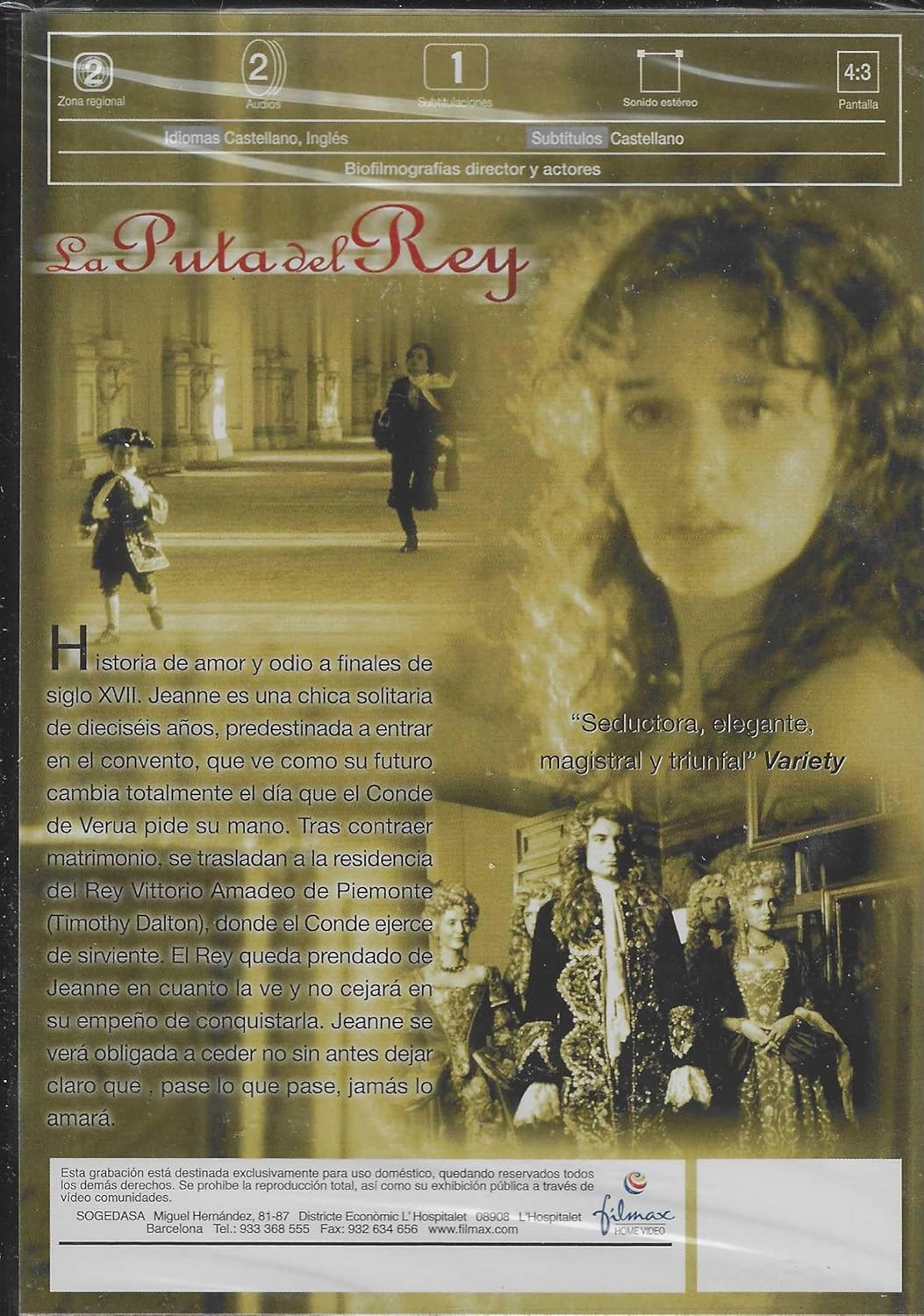 Descubre 'La Puta del Rey', una apasionante película histórica distribuida por Filmax que te transportará al siglo XVII. Esta cautivadora historia de amor y poder está disponible en DVD con audio en castellano e inglés, y subtítulos en castellano. La película, presentada en formato 4:3, narra la historia de Jeanne, una joven de dieciséis años destinada inicialmente al convento, cuya vida da un giro inesperado cuando el Conde de Verua pide su mano. Tras su matrimonio, la pareja se traslada a la residencia del Rey Vittorio Amadeo de Piemonte, donde el destino les depara giros dramáticos e inesperados. La crítica de Variety la describe como 'Seductora, elegante, magistral y triunfal'. Esta edición en DVD incluye biofilmografías del director y actores, ofreciendo una experiencia cinematográfica completa para los amantes del cine histórico y romántico. Una historia intensa sobre el poder, la pasión y las consecuencias de desafiar las convenciones de la época.