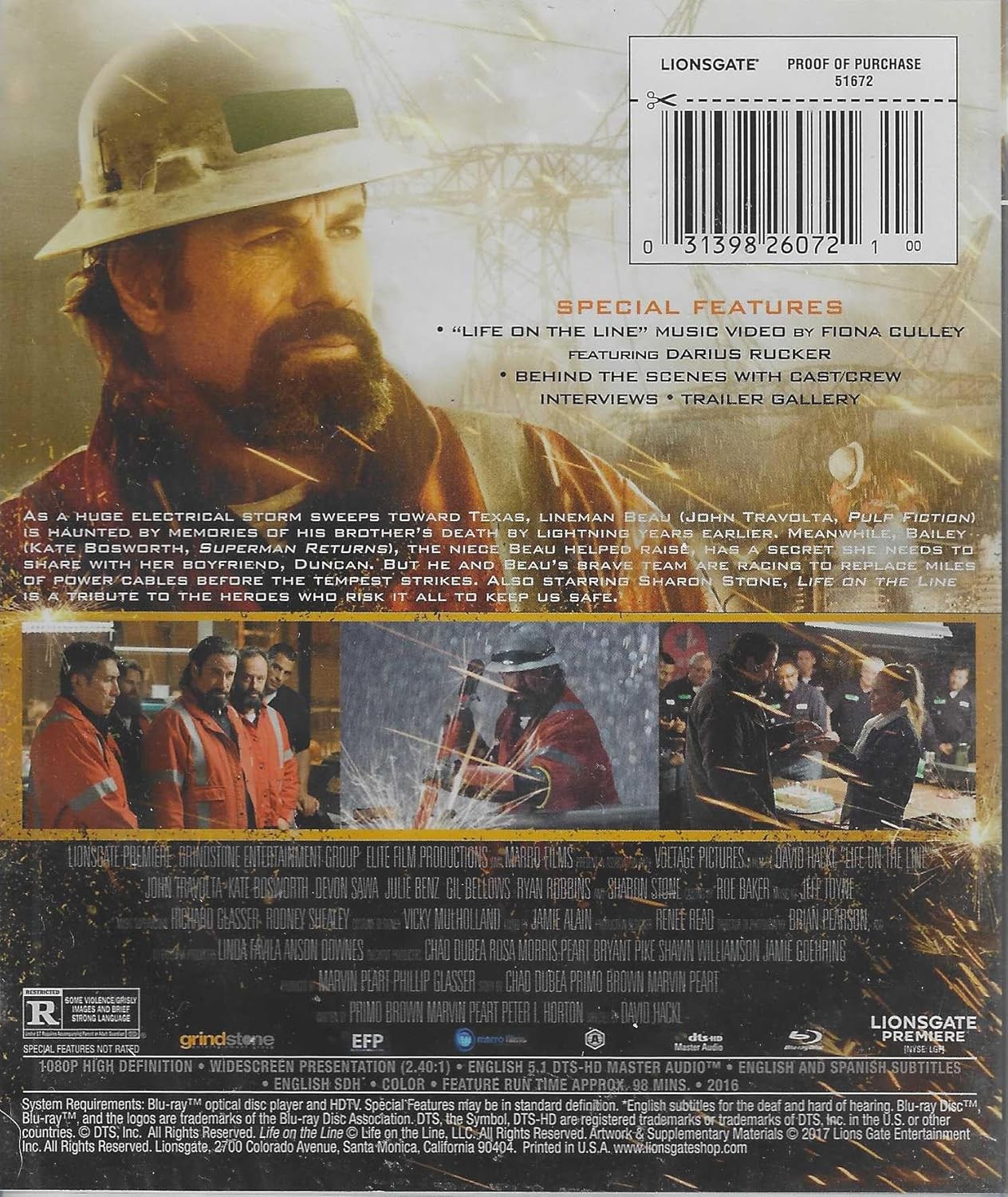 Life On The Line es una intensa película de acción protagonizada por un destacado elenco. La trama sigue a un equipo de valientes electricistas que se enfrentan a una poderosa tormenta eléctrica que amenaza Texas. En medio de condiciones extremadamente peligrosas, estos heroicos trabajadores arriesgan sus vidas para mantener la red eléctrica funcionando y proteger a la comunidad. Esta edición en Blu-ray ofrece una experiencia cinematográfica en alta definición 1080p con presentación widescreen (2.40:1) y audio DTS-HD Master 5.1. Incluye características especiales como un video musical de 'Life on the Line' por Fiona Culley con Darius Rucker, entrevistas entre bastidores con el elenco y equipo, y una galería de tráilers. El disco incluye subtítulos en inglés y español, haciéndolo accesible para una audiencia más amplia. Una historia conmovedora sobre coraje, riesgo y sacrificio que rinde homenaje a los verdaderos héroes que mantienen nuestras comunidades seguras.