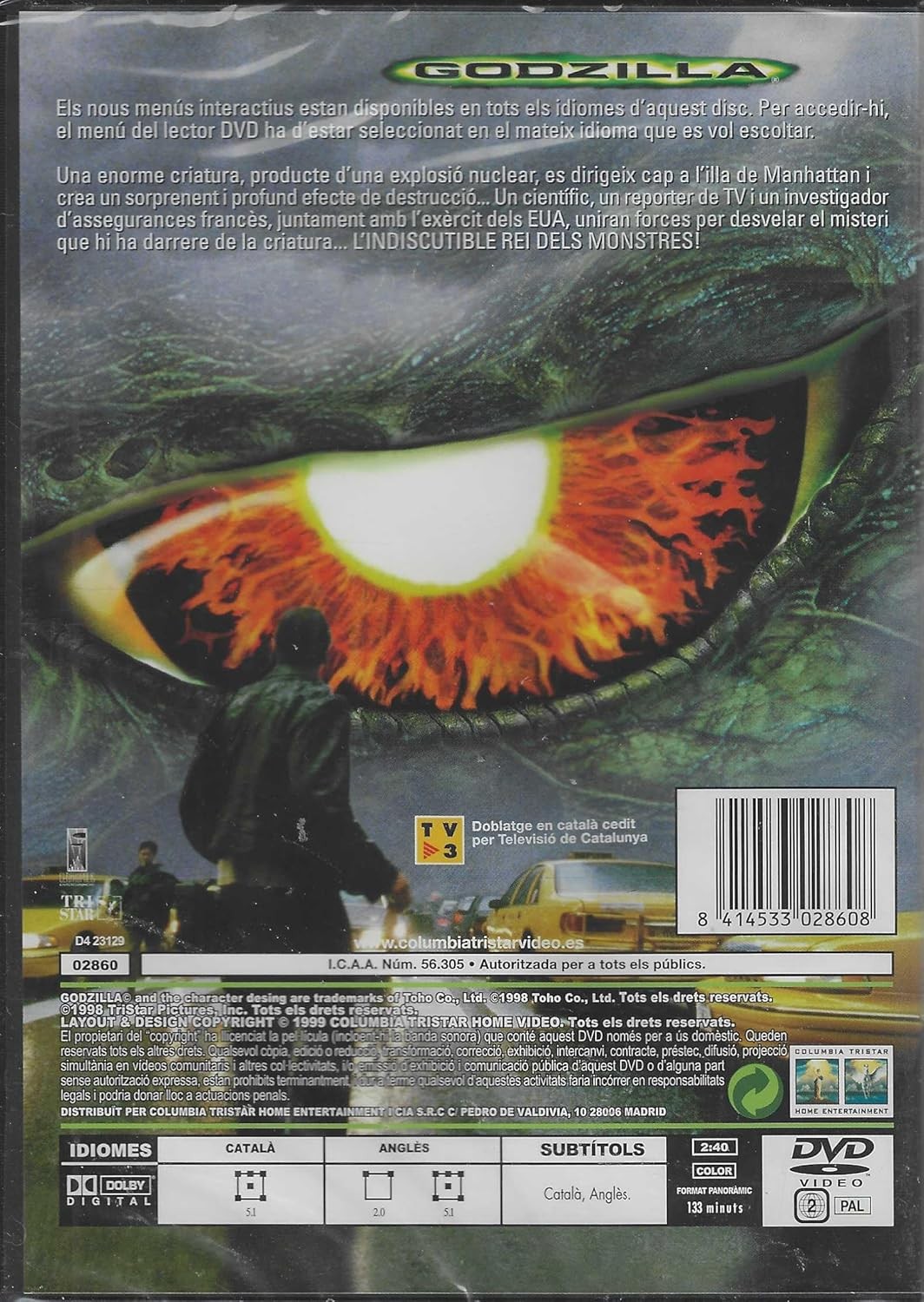 Experimenta la emocionante película Godzilla (1998) en DVD, distribuida por Columbia TriStar Home Entertainment. Esta épica película de acción y ciencia ficción presenta una criatura colosal que amenaza Manhattan, producto de una explosión nuclear. Con impresionantes efectos visuales y una narrativa cautivadora, la película sigue la historia de un equipo que une fuerzas con el ejército estadounidense para enfrentar esta amenaza sin precedentes. El DVD incluye audio en catalán e inglés, con subtítulos disponibles en ambos idiomas, permitiéndote disfrutar de la película en tu idioma preferido. Presentado en formato panorámico y con sonido Dolby Digital, esta edición ofrece una experiencia cinematográfica de alta calidad con una duración de 133 minutos. Los menús interactivos están disponibles en múltiples idiomas para facilitar la navegación. Una adición imprescindible para los aficionados del cine de monstruos y las películas de acción espectacular.