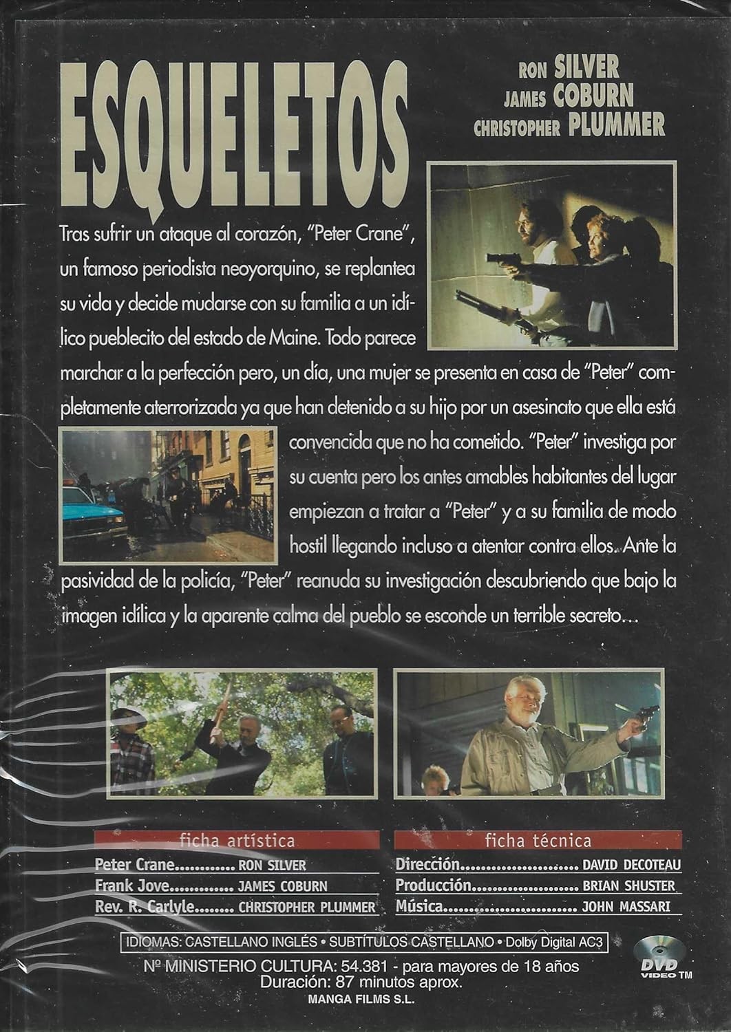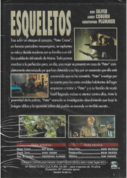 Esqueletos es un thriller psicológico protagonizado por Ron Silver, James Coburn y Christopher Plummer que te mantendrá en vilo desde el primer minuto. La historia sigue a Peter Crane, un famoso periodista neoyorquino que tras sufrir un ataque al corazón decide mudarse con su familia a un idílico pueblo de Maine en busca de tranquilidad. Sin embargo, la aparente calma del lugar se ve perturbada cuando una mujer aterrorizada llega a su casa afirmando que han arrestado a su hijo por un asesinato que no cometió. Lo que comienza como una investigación rutinaria se convierte en una pesadilla cuando los habitantes del pueblo empiezan a mostrar una hostilidad creciente hacia Peter y su familia. Con una duración de 87 minutos, este DVD incluye audio en castellano e inglés con subtítulos en castellano, ofreciendo una experiencia cinematográfica completa para los amantes del suspense y el misterio.