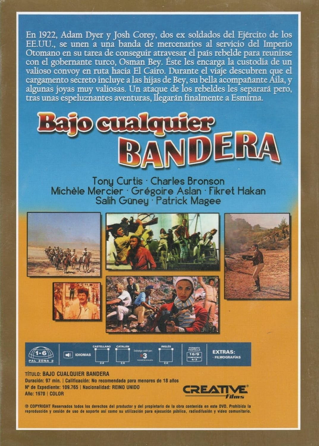 https://dvdstorespain.es/es/peliculas/128386-bajo-cualquier-bandera-dvd-coleccion-clasicos-del-cine-de-aventura-dvd-2024--0634065164782.html128386Bajo Cualquier Bandera [DVD] (1970) You Can't Win 'Em AllTurquía, 1922. Mientras el imperio otomano se derrumba, aventureros de todo el mundo, a cambio de una buena paga, arriesgan sus vidas para proteger a la población de ladrones y maleantes. Dos de estos mercenarios, Adam Dyer y Josh Corey, antiguos soldados americanos, son contratados por un gobernador turco para proteger un cargamento de oro y a sus tres hijas. Durante el camino, los "héroes" deciden olvidar su misión y fugarse con el dinero.https://dvdstorespain.es/1111457-home_default/bajo-cualquier-bandera-dvd-coleccion-clasicos-del-cine-de-aventura-dvd-2024-.jpg4.9587instockResearch4.95874.9587002025-12-18T03:15:21+0100/Inicio/Inicio/DVD/Inicio/Películas/Inicio/Nuevos