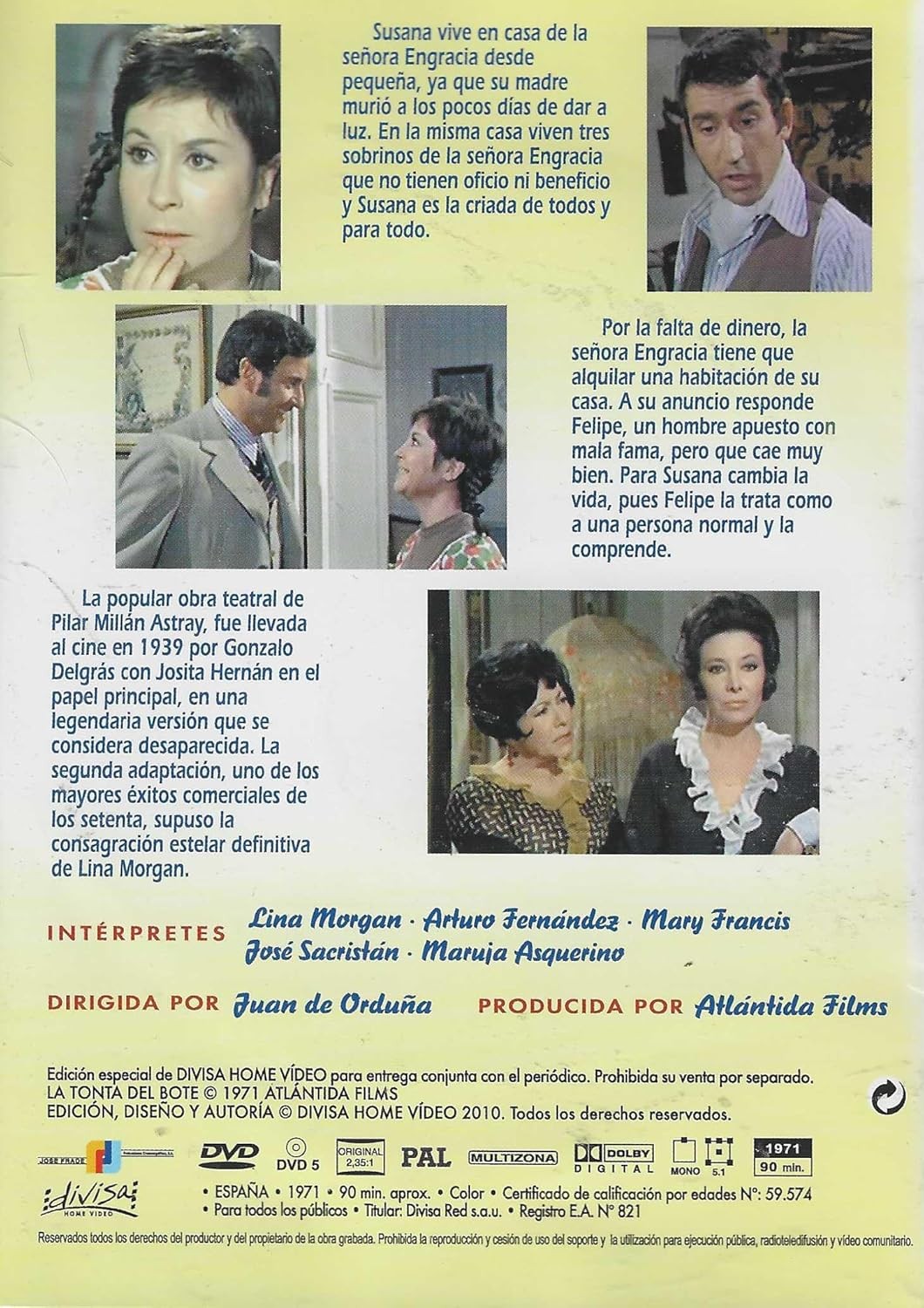 https://dvdstorespain.es/es/peliculas/128590-la-tonta-del-bote-dvd-edicion-sobre-dvd-2024--0634065165420.html128590La Tonta del Bote (Edición Sobre) [DVD] (1970)Susana (Lina Morgan) es una huérfana poco agraciada, ingenua y algo torpe que vive desde niña en casa de doña Engracia, pues su madre murió a los pocos días del parto. En esa casa, en la que también viven tres sobrinos de doña Engracia sin oficio ni beneficio, Susana es la criada de todos y para todo. Las necesidades económicas llevan a Engracia a alquilar una habitación. Al anuncio responde Felipe (Arturo Fernández), un hombre apuesto con mala fama, pero que cae muy bien. https://dvdstorespain.es/1114990-home_default/la-tonta-del-bote-dvd-edicion-sobre-dvd-2024-.jpg4.9587instock4.95874.9587002025-12-27T06:47:33+0100/Inicio/Inicio/DVD/Inicio/Películas/Inicio/Nuevos
