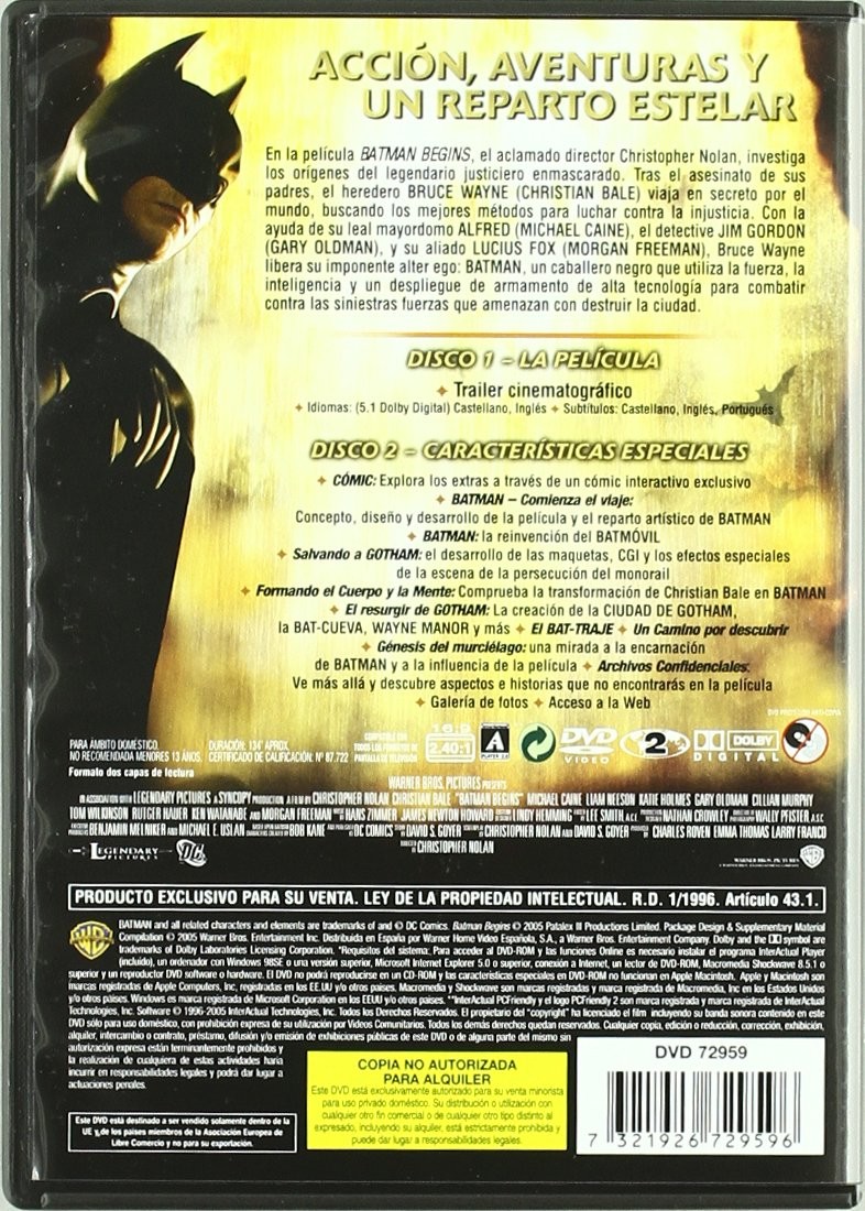 En la película Batman Begins, el aclamado director Christopher Nolan, investiga los orígenes del legendario justiciero enmascarado. Tras el asesinato de sus padres, el heredero Bruce Wayne (Christian Bale) viaja en secreto por el mundo, buscando los mejores métodos para luchar contra la injusticia. Con la ayuda de su leal mayordomo Alfred (Michael Caine), el detective Jim Gordon (Gary Oldman), y su aliado Lucius Fox (Morgan Freeman), Bruce Wayne libera su imponente alter ego: Batman, un caballero negro que utiliza la fuerza, la inteligencia y un despliegue de armamento de alta tecnología para combatir contra las fuerzas que amenazan con destruir la ciudad..