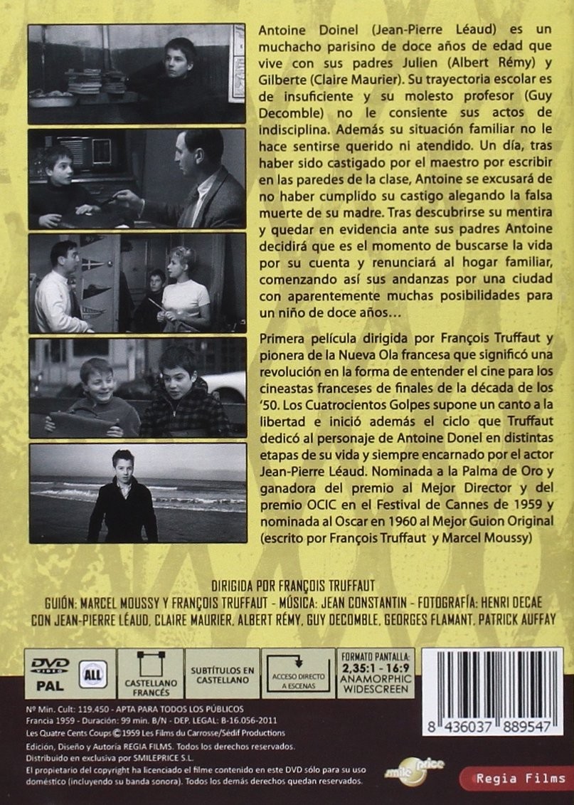 Antoine Doinel (Jean-Pierre Léaud) es un muchacho parisino de doce años de edad que vive con sus padres Julien (Albert Rémy) y Gilberte (Claire Maurier). Su trayectoria escolar es de insuficiente y su molesto profesor (Guy Decomble) no le consiente sus actos de indisciplina. Además su situación familiar no le hace sentirse querido ni atendido. Un día, tras haber sido castigado por el maestro por escribir en las paredes de la clase, Antoine se excusará de no haber cumplido su castigo alegando la falsa muerte de su madre. Tras descubrirse su mentira y quedar en evidencia ante sus padres Antoine decidirá que es el momento de buscarse la vida por su cuenta y renunciará al hogar familiar, comenzando así sus andanzas por una ciudad con aparentemente muchas posibilidades para un niño de doce años…Primera película dirigida por François Truffaut y pionera de la Nueva Ola francesa que significó una revolución en la forma de entender el cine para los cineastas franceses de finales de la década de los ‘50. Los Cuatrocientos Golpes supone un canto a la libertad e inició además el ciclo que Truffaut dedicó al personaje de Antoine Donel en distintas etapas de su vida y siempre encarnado por el actor Jean-Pierre Léaud. Nominada a la Palma de Oro y ganadora del premio al Mejor Director y del premio OCIC en el Festival de Cannes de 1959 y nominada al Oscar en 1960 al Mejor Guion Original (escrito por François Truffaut y Marcel Moussy).