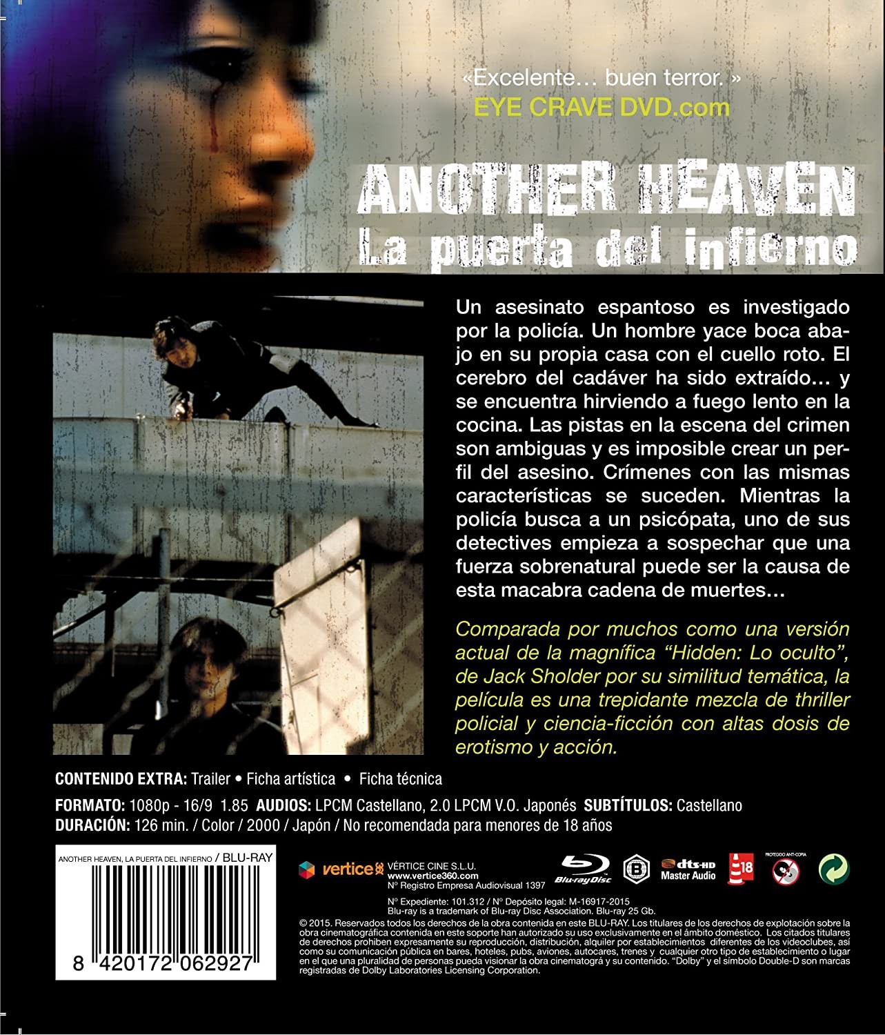https://dvdstorespain.es/es/peliculas/26678-another-heaven-la-puerta-del-infierno-blu-ray-2000-another-heaven-anazahevun-8420172062927.html26678Another Heaven: La Puerta del Infierno [Blu-ray] (2000) Another Heaven (Anazahevun)Dos inspectores de policía de Tokio investigan un grotesco asesinato: tras atar a su víctima, el asesino le ha abierto el craneo y cocinado el cerebro. Pronto caerán en la cuenta que todos aquellos relacionados con la víctima son literalmente sospechosos. En pocos días, otros asesinatos calcados al primero teñirán de sangre las aceras de la ciudad. Ahora deberán enfrentarse a varios asesinos en serie que parecen actuar coordinados...https://dvdstorespain.es/237478-home_default/another-heaven-la-puerta-del-infierno-blu-ray-2000-another-heaven-anazahevun.jpg5.7025instockvertice5.70255.7025002016-04-18T00:31:07+0200/Inicio/Inicio/Blu-ray/Inicio/Películas/Inicio/Nuevos/Inicio/18 AÑOS SI D&O
