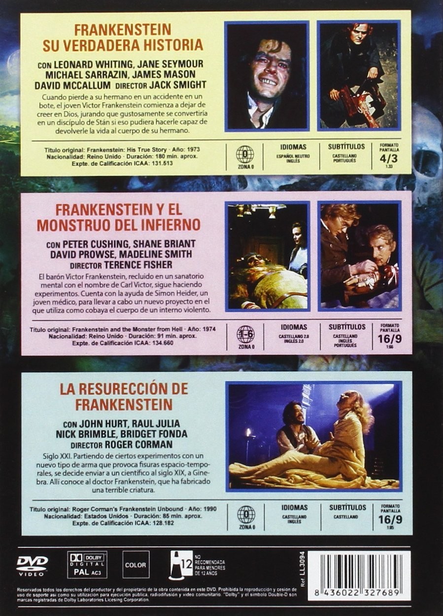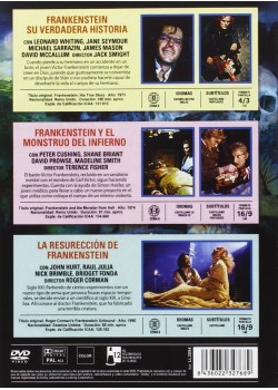 https://dvdstorespain.es/es/peliculas/33680-frankenstein-trilogia-pack-dvd--8436022327689.html33680Frankenstein - Trilogía (Pack) [DVD]<div> <!-- show up to 2 reviews by default --><br /><p> <span>- Frankenstein, su Verdadera Historia<br />Cuando pierde a su hermano en un accidente en un bote, el joven Victor Frankenstein comienza a dejar de creer en Dios, jurando que se convertiría en discípulo de Satán si eso pudiera hacerle capaz de devolverle la vida al cuerpo de su hermano. Decide continuar sus estudios médicos en Londres donde, con la ayuda del Dr. Henry Clerval, comienza a investigar la posibilidad de reanimar cadáveres.<br /><br />- Frankenstein y el Monstruo del Infierno<br />El barón Victor Frankenstein sigue experimentando con la vida después de la muerte. En un sanatorio mental y bajo el nombre de Dr. Carl Victor, el barón recluta al joven doctor Simon Helder para realizar uno de sus oscuros experimentos científicos.<br /><br />- La Resurrección de Frankenstein<br />Después de ciertos experimentos con un nuevo tipo de arma, que provoca fisuras espacio-temporales, se decide enviar a un científico al siglo XIX. Allí conoce al doctor Frankenstein.</span> </p> </div>https://dvdstorespain.es/765764-home_default/frankenstein-trilogia-pack-dvd-.jpg11.5702instock11.570211.5702002016-11-21T08:09:09+0100/Inicio/Inicio/DVD/Inicio/Películas/Inicio/Nuevos/Inicio/VELADA SP 20
