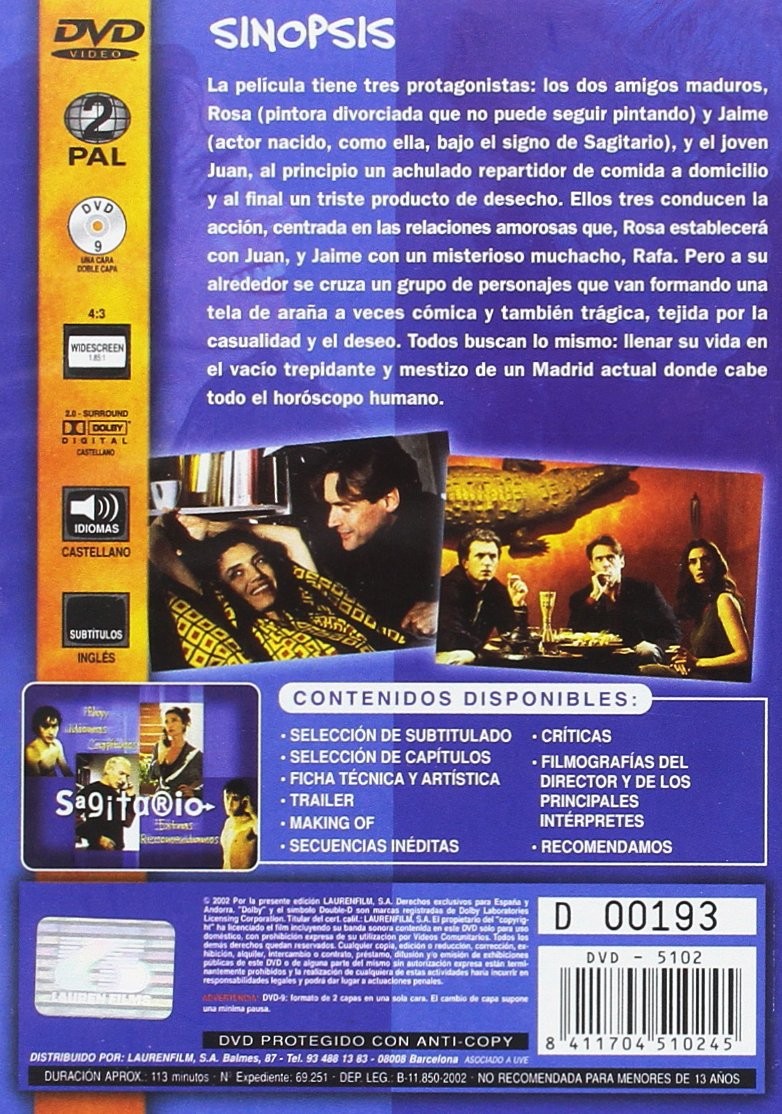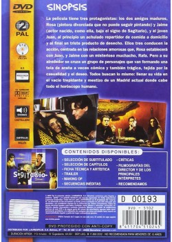 https://dvdstorespain.es/es/peliculas/36071-sagitario-dvd-2001-8411704510245.html36071Sagitario [DVD] (2001)Rosa y Jaime son amigos y ambos han nacido bajo el signo de Sagitario. En torno a ellos se forma un heterogéneo grupo de personajes con unas vivencias, a veces trágicas, a veces cómicas, motivadas por el deseo y la casualidad. Adolescentes, emigrantes, una viuda cubana, gente con pasado escabroso y hasta espiritistas integran este particular grupo cuya única y común obsesión es llenar sus vidas en un Madrid trepidante y mestizo donde caben todos los signos del Zodiaco. Debut en la dirección del escritor Vicente Molina Foix.https://dvdstorespain.es/518165-home_default/sagitario-dvd-2001.jpg4.4628instockFILMAX4.46284.4628002017-08-03T17:40:22+0200/Inicio/Inicio/DVD/Inicio/Películas/Inicio/Nuevos/Inicio/VELADA SP 70/Inicio/Homenaje a Eusebio Poncela