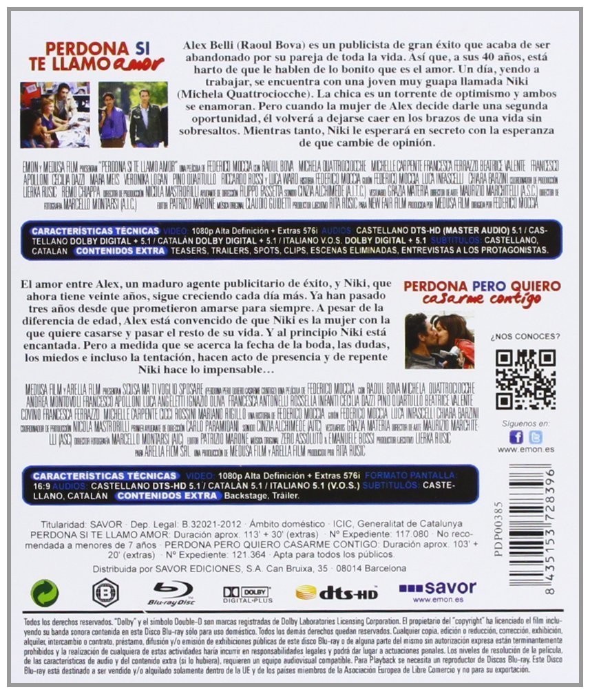https://dvdstorespain.es/es/peliculas/48469-pack-perdona-si-te-llamo-amor-perdona-pero-quiero-casarme-contigo-blu-ray-blu-ray--8435153728396.html48469Pack: Perdona Si Te Llamo Amor + Perdona Pero Quiero Casarme Contigo [Blu-ray]<div id="productDescription" class="a-section a-spacing-small"> <!-- show up to 2 reviews by default --><br /><p> <span>- Perdona si te Llamo Amor:<br />Niki es una joven madura y responsable que cursa su último año de secundaria. Alessandro es un exitoso publicista de 37 años a quien acaba de dejar su novia de toda la vida. A pesar de los 20 años de diferencia que hay entre ambos y del abismo generacional que los separa, Niki y Alessandro se enamorarán locamente y vivirán una apasionada historia de amor en contra de todas las convenciones y prejuicios sociales. Perdona si te llamo amor es la adaptación cinematográfica del fenómeno literario a escala mundial en que se ha convertido la literatura de Federico Moccia. <br /><br />- Perdona pero Quiero Casarme Contigo :<br />Alex y Niki, más enamoradísimos que nunca, hace nada que volvieron de la Isla Azul donde vivieron días inolvidables. Niki se reencuentra con sus amigas del alma, crecidas y llenas de nuevos quehaceres. Pero pronto las Olas tendrán que afrontar grandes cambios que pondrán a prueba su amistad.</span> </p> </div>https://dvdstorespain.es/672955-home_default/pack-perdona-si-te-llamo-amor-perdona-pero-quiero-casarme-contigo-blu-ray-blu-ray-.jpg8.2645instock8.26458.2645002019-03-25T23:09:46+0100/Inicio/Inicio/Blu-ray/Inicio/Películas/Inicio/Nuevos