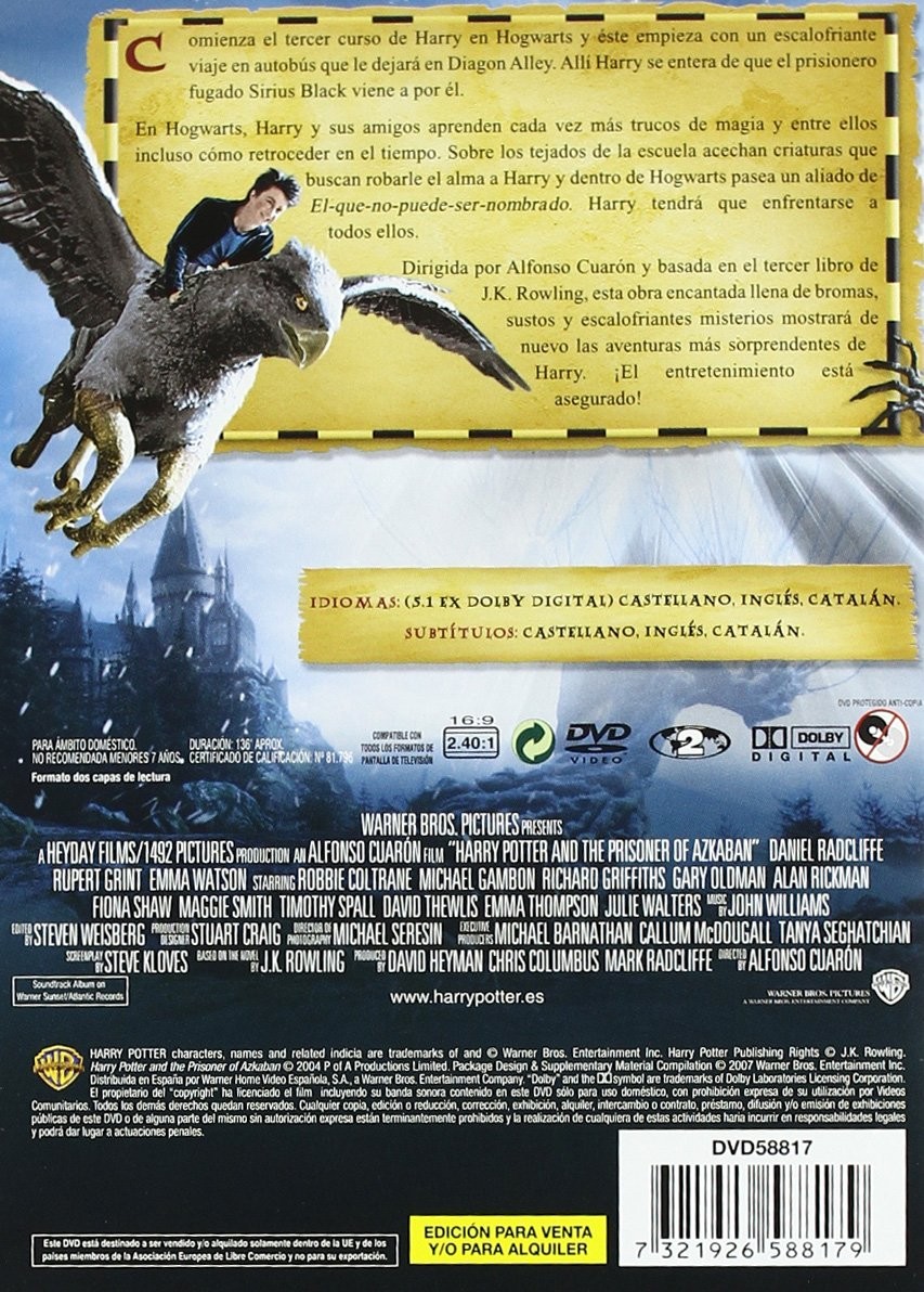 https://dvdstorespain.es/es/peliculas/4888-harry-potter-el-prisionero-de-azkaban-dvd-2004-7321926588179.html4888Harry Potter: El Prisionero de Azkaban [DVD] (2004)Cuando Harry Potter y sus amigos vuelven a Hogwarts para cursar su tercer año de estudios, se ven involucrados en un misterio: de la prisión para magos de Azkaban se ha fugado Sirius Black, un peligroso mago que fue cómplice de Lord Voldemort y que intentará vengarse de Harry Potter. El joven aprendiz de mago contribuyó en gran medida a la condena de Sirius, por lo que hay razones para temer por su vida.https://dvdstorespain.es/244981-home_default/harry-potter-el-prisionero-de-azkaban-dvd-2004.jpg4.4628instockWarner Home Video España, S.L.4.46284.4628002015-04-10T20:18:03+0200/Inicio/Inicio/DVD/Inicio/Películas/Inicio/Nuevos/Inicio/Homenaje a Maggie Smith
