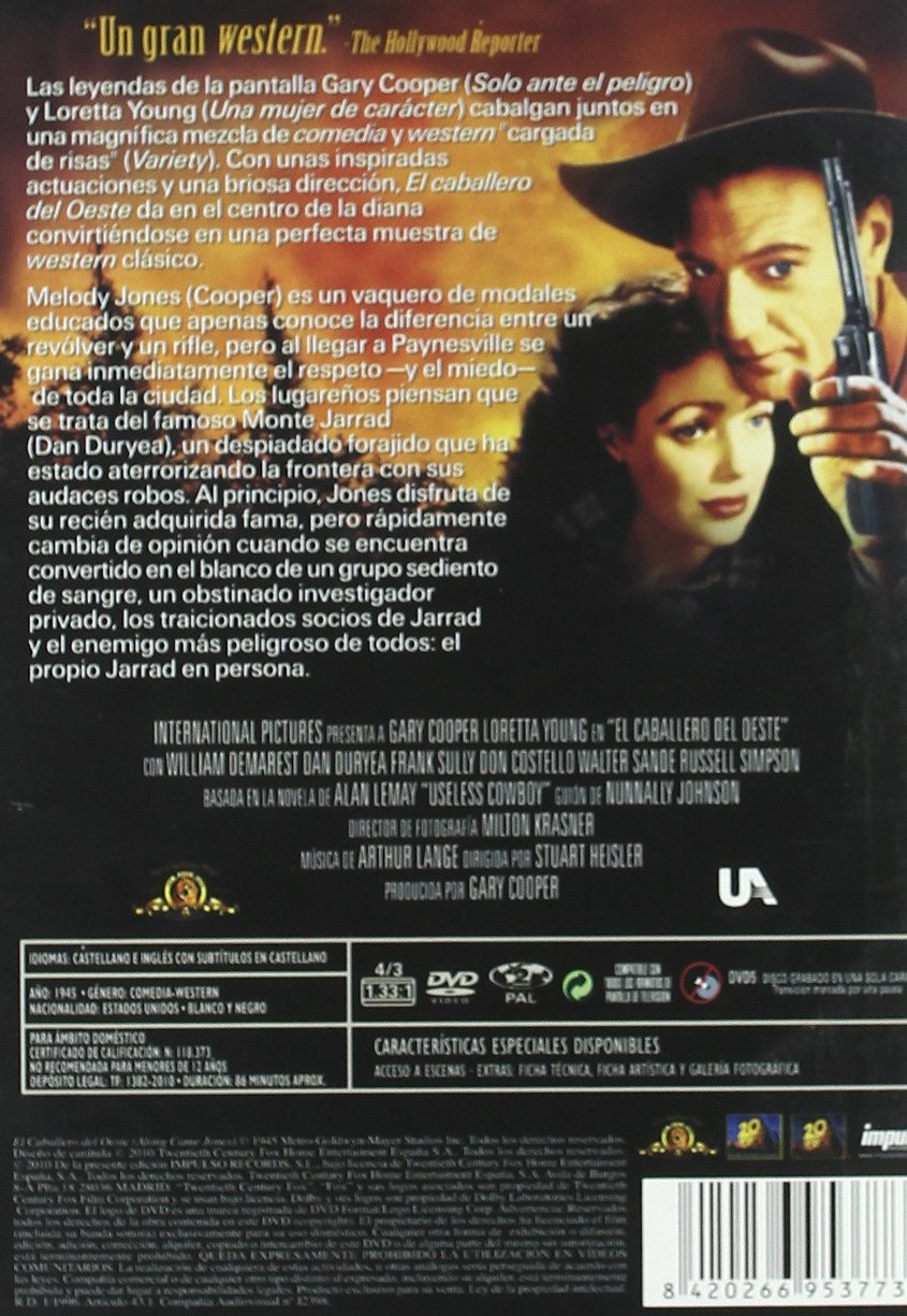 https://dvdstorespain.es/es/peliculas/500-el-caballero-del-oeste-dvd--8420266953773.html500EL CABALLERO DEL OESTE (DVD)<div> <!-- show up to 2 reviews by default --><br /><p> <span>Dos Cowboys se ven envueltos en una terrible confusión. Uno se llama Melody Jones (Gary Cooper), y el otro es Monte Jarrad, un pistolero reclamado y buscado por las autoridades, acusado de robos y asesinatos. Cuando el primero llega a la ciudad de Payville con su socio, sus habitantes creen reconocer en él al forajido. Pero Melody, lejos de desmentir la confusión, decide suplantar al forajido por el amor de una mujer (Loretta Young), antigua novia de Jarrad...</span> </p> </div>https://dvdstorespain.es/246895-home_default/el-caballero-del-oeste-dvd-.jpg4.4554instockImpulso4.45544.4554002015-04-07T23:57:57+0200/Inicio/Inicio/DVD/Inicio/Películas/Inicio/Nuevos/Inicio/VELADA SP 70