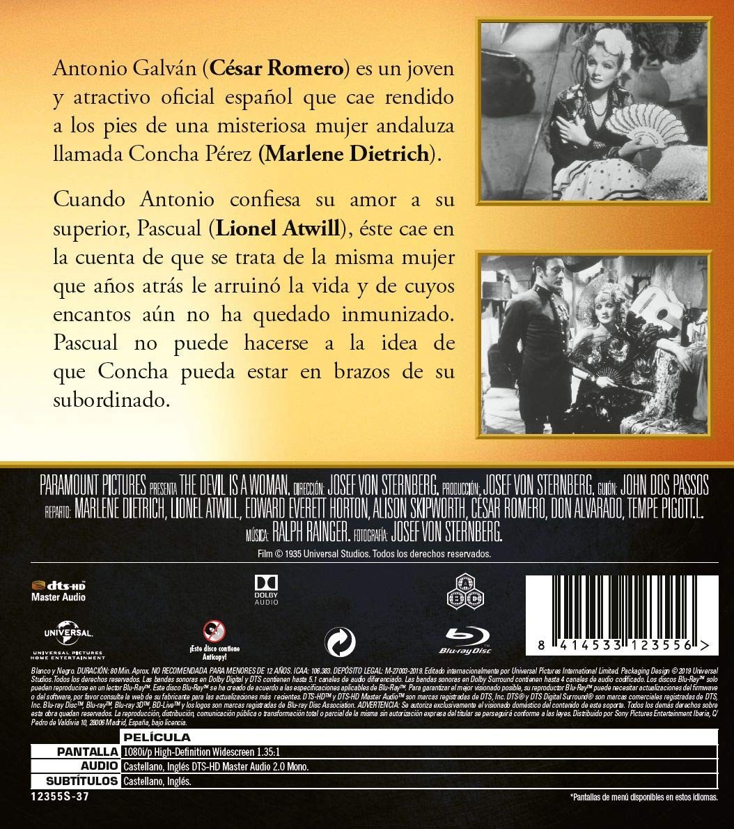 España Edition, Blu-Ray/Region A/B/C DVD: IDIOMAS: Español ( Dolby Digital 2.0 ), Español ( DTS-HD Master Audio ), Inglés ( Dolby Digital 2.0 ), Inglés ( DTS-HD Master Audio ), Español ( Subtitulos ), Inglés ( Subtitulos ), EXTRAS: Acceso De la Escena, Menú Interactivo, SYNOPSIS: Antonio Galván (César Romero) es un joven y atractivo oficial español que cae rendido a los pies de una misteriosa mujer andaluza llamada Concha Pérez (Marlene Dietrich). Cuando Antonio confiesa su amor a su superior, Pascual (Lionel Atwill), éste cae en la cuenta de que se trata de la misma mujer que años atrás le arruinó la vida y de cuyos encantos aún no ha quedado inmunizado. Pascual no puede hacerse a la idea de que Concha pueda estar en brazos de su subordinado. APANTALLADO/ADJUDICADO EL: Festival De la Película De Venecia, ...El diablo es una mujer / The Devil Is a Woman (Blu-Ray)