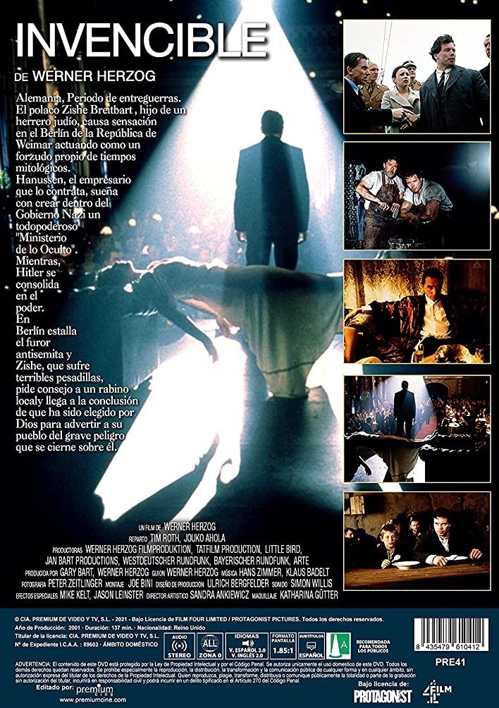 https://dvdstorespain.es/es/peliculas/88822-invencible-dvd-2001-invincible-dvd--8435479610412.html88822Invencible [DVD] (2001) InvincibleAlemania, 1932. El polaco Zishe Breitbart, hijo de un herrero judío, causa sensación en el Berlín de la República de Weimar (1919-1933) actuando como un forzudo propio de tiempos mitológicos. Hanussen, el empresario que lo contrata, sueña con crear dentro del Gobierno nazi (1933-1945) un todopoderoso "Ministerio de lo Oculto". Mientras Hitler se va consolidando día a día en el poder y en Berlín estalla el furor antisemita, Zishe, que sufre terribles pesadillas, pide consejo a un rabino local y llega a la conclusión de que ha sido elegido por Dios para advertir a su pueblo del grave peligro que se cierne sobre él. https://dvdstorespain.es/424930-home_default/invencible-dvd-2001-invincible-dvd-.jpg7.3554instockResearch Entertainment7.35547.3554002021-05-16T00:42:54+0200/Inicio/Inicio/DVD/Inicio/Películas/Inicio/Nuevos/Inicio/VELADA SP 70/Inicio/VELADA DE 100/Inicio/VELADA FR 100/Inicio/VELADA IT 100