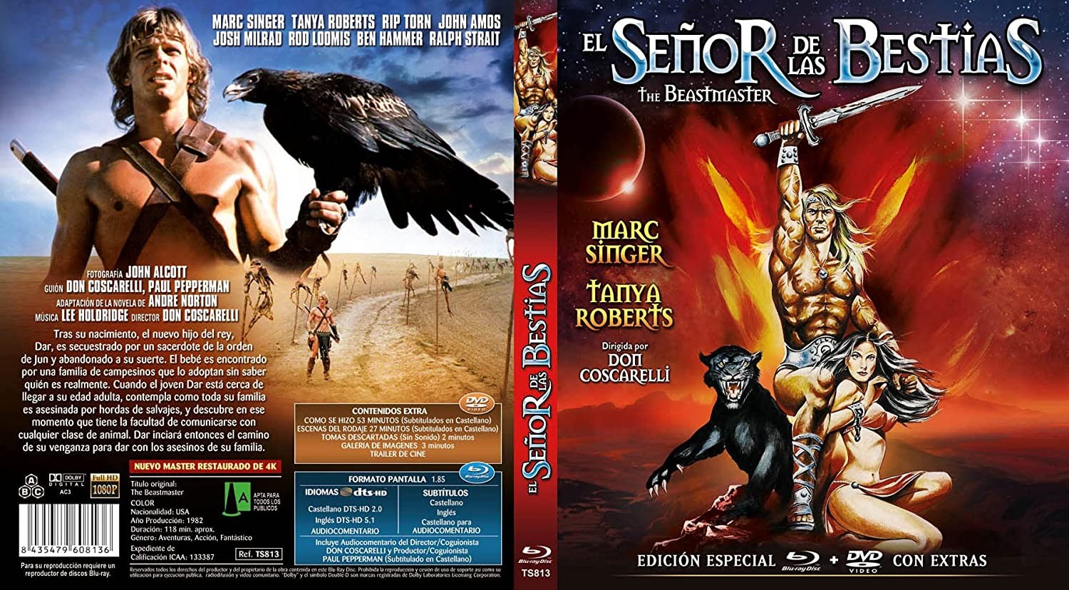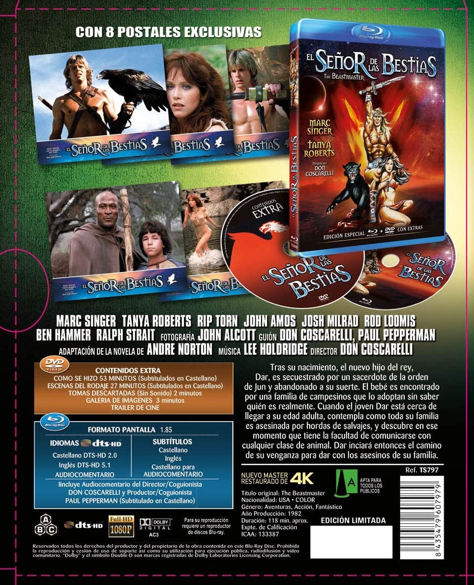 https://dvdstorespain.es/es/peliculas/90870-el-senor-de-las-bestias-bd-dvd-1982-the-beastmaster-con-extras-edicion-especial-limitada-con-8-postales-blu-ray-dvd--8435479607979.html90870El Señor de las Bestias BD + DVD 1982 The Beastmaster Con Extras Edición Especial Limitada Con 8 Postales [Blu-ray, DVD]<div> <br /> Sinopsis: Tras su nacimiento, el nuevo hijo nonato del rey, Dar, es secuestrado por un sacerdote de la orden de Jun y abandonado a su suerte. El bebé es encontrado por una familia de campesinos que lo adoptan sin saber quién es realmente. Cuando el joven Dar está cerca de llegar a su edad adulta, contempla como toda su familia es asesinada por hordas de salvajes, y descubre en ese momento que tiene la facultad de comunicarse con cualquier clase de animal. Dar inciará entonces el camino de su venganza para dar con los asesinos de su familia. Extras: Cómo se hizo (53 min) + Escenas de rodaje (27 min.) (subtitulado en castellano) + Tomás descartadas + Galería de imágenes + Trailer de Cine </div>https://dvdstorespain.es/399205-home_default/el-senor-de-las-bestias-bd-dvd-1982-the-beastmaster-con-extras-edicion-especial-limitada-con-8-postales-blu-ray-dvd-.jpg12.3141instockResearch Entertainment12.314112.3141002021-11-06T00:41:07+0100/Inicio/Inicio/DVD/Inicio/Blu-ray/Inicio/Películas/Inicio/Nuevos/Inicio/VELADA SP 20/Inicio/VELADA DE 50/Inicio/VELADA FR 50/Inicio/VELADA IT 50