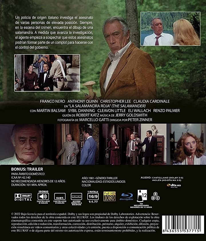 https://dvdstorespain.es/es/peliculas/92911-la-salamandra-roja-bd-1981-the-salamander-blu-ray--8436555537715.html92911La Salamandra Roja [Blu-ray] (1981) The SalamanderUn policía de origen italiano investiga el asesinato de varias personas de elevada posición. Siempre, en la escena del crimen, encuentra el dibujo de una salamandra. A medida que avanza la investigación, el agente empieza a sospechar que estos asesinatos podrían formar parte de un complot para hacerse con el control del gobierno.https://dvdstorespain.es/370913-home_default/la-salamandra-roja-bd-1981-the-salamander-blu-ray-.jpg4.686instockResearch Entertainment6.69424.68629.9991037017122.00832022-03-22T01:56:03+0100/Inicio/Inicio/Blu-ray/Inicio/Películas/Inicio/Nuevos/Inicio/VELADA SP 70/Inicio/VELADA DE 100/Inicio/VELADA FR 100/Inicio/VELADA IT 100/Inicio/REBAJAS DE HALLOWEN/Inicio/REBAJAS DE HALLOWEN/-30%/Inicio/Homenaje a Claudia Cardinale
