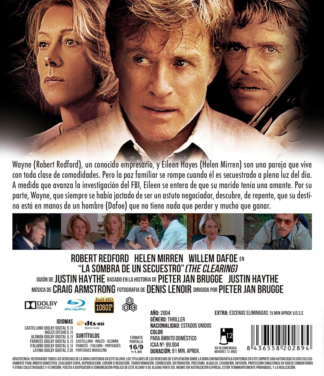 https://dvdstorespain.es/es/preventa/127163-la-sombra-de-un-secuestro-bd-2004-the-clearing-blu-ray-0018--8436558202894.html127163La Sombra De Un Secuestro [Blu-ray] (2004) The ClearingWayne (Robert Redford), un conocido empresario, y Eileen Hayes (Helen Mirren) son una pareja que vive con toda clase de comodidades. Pero la paz familiar se rompe cuando él es secuestrado a plena luz del día. A medida que avanza la investigación del FBI, Eileen se entera de que su marido tenía una amante. Por su parte, Wayne, que siempre se había jactado de ser un astuto negociador, descubre, de repente, que su destino está en manos de un hombre (Dafoe) que no tiene nada que perder y mucho que ganar.https://dvdstorespain.es/1087386-home_default/la-sombra-de-un-secuestro-bd-2004-the-clearing-blu-ray-0018-.jpg10.7025instockResen10.702510.7025002025-10-08T21:15:15+0200/Inicio/Inicio/Blu-ray/Inicio/Películas/Inicio/Preventa