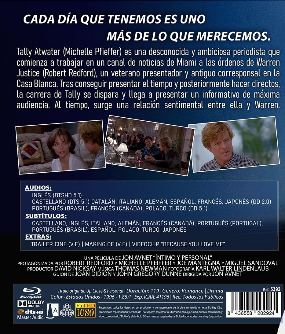 https://dvdstorespain.es/es/preventa/127166-intimo-y-personal-bd-1996-up-close-personal-blu-ray-0018--8436558202924.html127166Íntimo Y Personal [Blu-ray] (1996) Up Close & PersonalTally Atwater (Michelle Pfieffer) es una desconocida y ambiciosa periodista que comienza a trabajar en un canal de noticias de Miami a las órdenes de Warren Justice (Robert Redford), un veterano presentador y antiguo corresponsal en la Casa Blanca. Tras conseguir presentar el tiempo y posteriormente hacer directos, la carrera de Tally se dispara y llega a presentar un informativo de máxima audiencia. Al tiempo, surge una relación sentimental entre ella y Warren.https://dvdstorespain.es/1087392-home_default/intimo-y-personal-bd-1996-up-close-personal-blu-ray-0018-.jpg10.7025instockResen10.702510.7025002025-10-08T21:15:42+0200/Inicio/Inicio/Blu-ray/Inicio/Películas/Inicio/Preventa