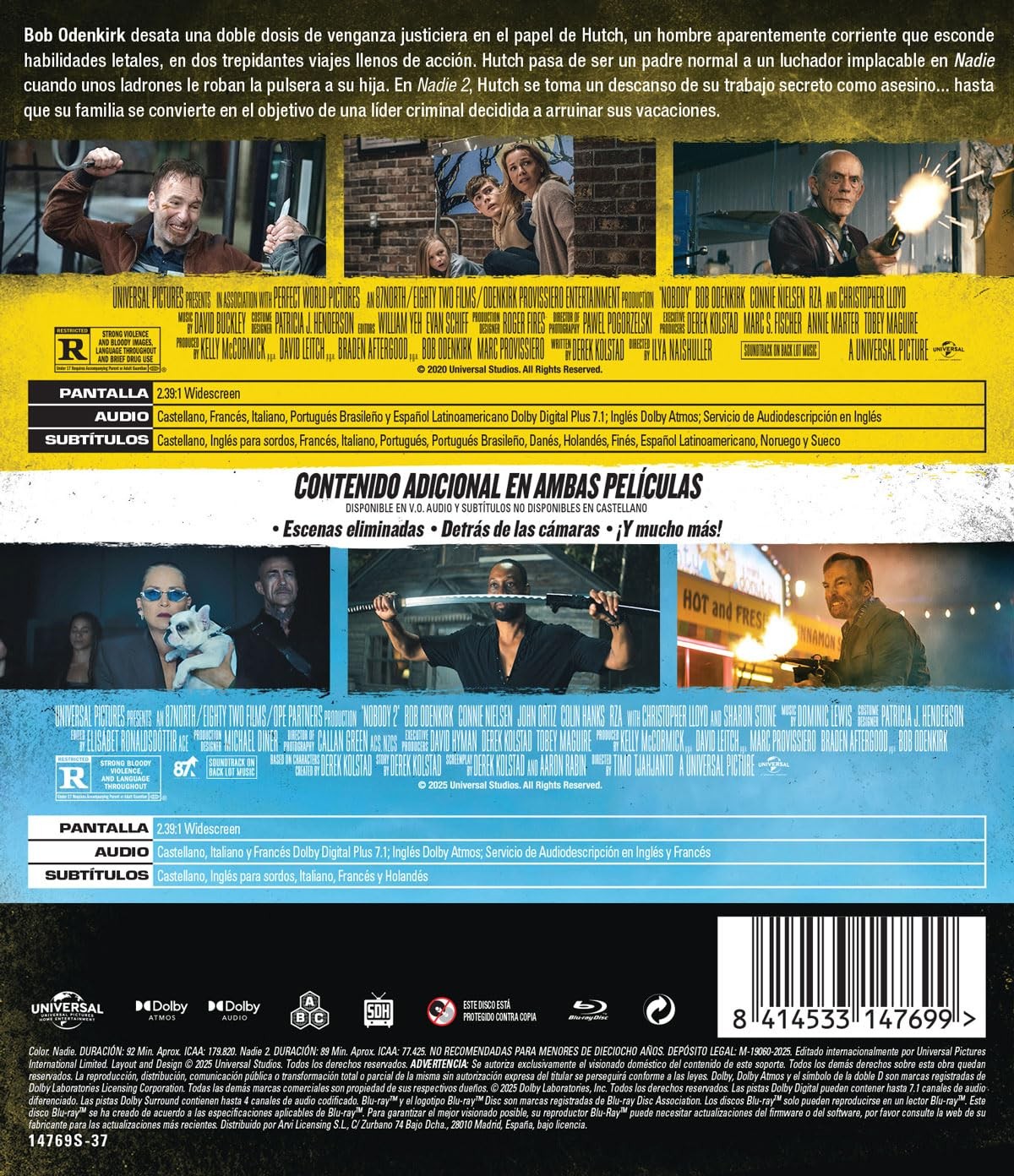 https://dvdstorespain.es/es/preventa/127572-nadie-1-2-bd-blu-ray-2025--8414533147699.html127572Nadie + Nadie 2 [Blu-ray] (2021, 2025) Nobody + Nobody 2<p><b>Nadie</B><br>Hutch Mansell (Bob Odenkirk) es un hombre de familia corriente. Una noche unos ladrones entran a su casa y él renuncia a defenderse y defender a su familia con el fin de evitar complicaciones. Esto decepciona a su hijo Blake (Gage Munroe) y a su mujer Becca (Connie Nielsen) que empiezan a distanciarse de él. El incidente le reconcome por dentro y hace que salga a la luz su lado más oscuro.</p><p><b>Nadie 2</B><br>Cuatro años después de enfrentarse involuntariamente a la mafia rusa, Hutch sigue manteniendo con la organización criminal una deuda de 30 millones de dólares que trata de saldar poco a poco con una serie interminable de golpes contra matones internacionales. Pese a disfrutar como siempre de la faceta más trepidante y física de su «trabajo», Hutch y su esposa Becca se sienten agotados y distanciados. Para intentar remediarlo, deciden llevarse a sus hijos de escapada al mismo lugar al que Hutch iba de vacaciones con su hermano Harry cuando eran pequeños.https://dvdstorespain.es/1094854-home_default/nadie-1-2-bd-blu-ray-2025-.jpg23.0579instockARVI23.057923.0579002025-10-29T02:35:48+0100/Inicio/Inicio/Blu-ray/Inicio/Películas/Inicio/Preventa