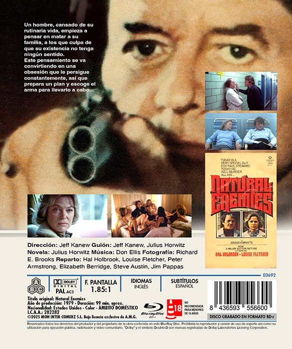 https://dvdstorespain.es/es/preventa/127779-enemigos-naturales-8436593556600.html127779Enemigos Naturales [Blu-ray R] (1979) Natural Enemies<p>Un hombre, cansado de su rutinaria vida, empieza a pensar en acabar con su familia. Matar a su "querida" esposa, a sus "queridos" hijos y a todos sus "queridos" amigos, todos los que han hecho que su existencia no tenga ahora ningún sentido. Este pensamiento se va convirtiendo en una obsesión que le persigue constantemente, así que prepara un plan y escoge el arma para llevarlo a cabo, pero antes de realizarlo habla con alguien. El desenlace se avecina.</p>https://dvdstorespain.es/1098899-home_default/enemigos-naturales.jpg9.0909instock9.09099.0909002025-11-07T20:26:44+0100/Inicio/Inicio/Películas/Inicio/Preventa/Inicio/Blu-ray R