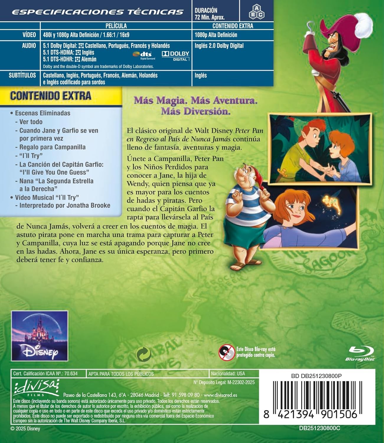 https://dvdstorespain.es/es/preventa/127858-peter-pan-en-regreso-al-pais-de-nunca-jamas-peter-pan-return-to-neverland-2002-blu-ray-blu-ray-2025--8421394901506.html127858Peter Pan: Regreso Al País De Nunca Jamás [Blu-ray] (2002) Peter Pan: Return to NeverLandPeter Pan sigue siendo el líder de los Niños Perdidos y librando batallas con el malvado Capitán Garfio, con la ayuda de Campanilla. Pero aunque Peter Pan nunca creció, todo a su alrededor ha cambiado: Wendy es ahora madre de una niña llamada Jane. Jane ya no cree en cuentos de hadas, y ¡mucho menos en volar!. Pero cuando el Capitán Garfio la secuestra y la lleva al país de Nunca Jamás, Peter Pan conseguirá que su imaginación vuele otra vez. https://dvdstorespain.es/1100031-home_default/peter-pan-en-regreso-al-pais-de-nunca-jamas-peter-pan-return-to-neverland-2002-blu-ray-blu-ray-2025-.jpg10.7025instockDivisa HV - Disney10.702510.7025002025-11-12T09:47:31+0100/Inicio/Inicio/Blu-ray/Inicio/Películas/Inicio/Preventa